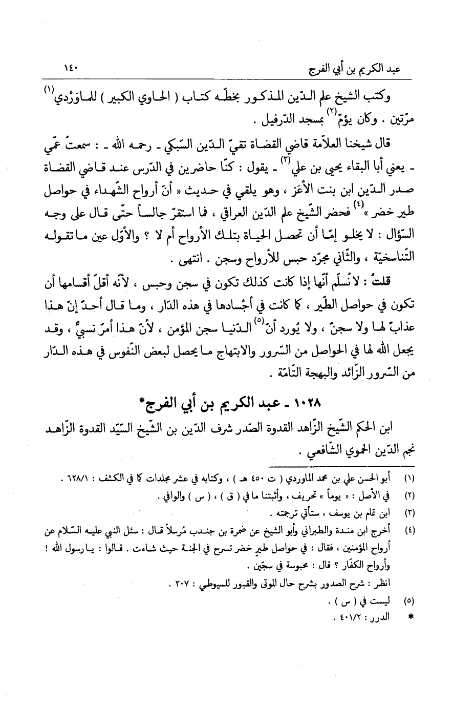 قال شيخنا العلامة قاضي القضاة تقي الدين السبكي رحمه الله: سمعت عمي - يعني أبا البقاء يحيى بن علي - يقول: كنا حاضرين في الدرس عند قاضي القضاة صدر الدين ابن بنت الأعز، وهو يلقي في حديث " أن أرواح الشهداء في حواصل طير خضر " فحضر الشيخ علم الدين العراقي، فما استقر جالساً حتى قال على وجه السؤال: لا يخلو إما أن تحصل الحياة بتلك الأرواح أم لا؟ والأول عين ما تقوله التناسخية، والثاني مجرد حبس للأرواح وسجن. انتهى.