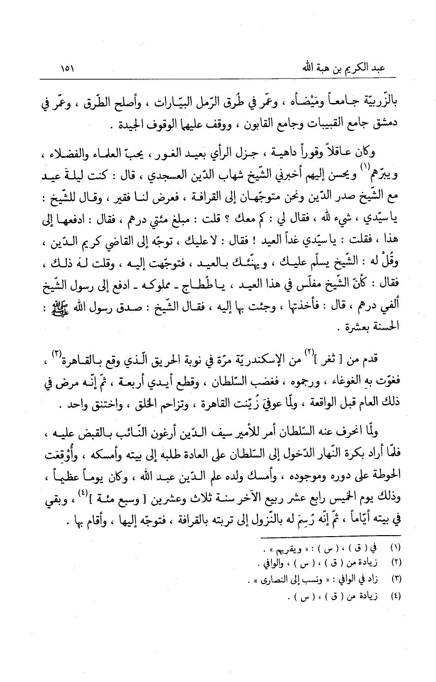 وكان عاقلاً وقوراً داهية، جزل الرأي بعيد الغور، بحب العلماء والفضلاء، ويبرهم ويحسن إليهم أخبرني الشيخ شهاب الدين العسجدي، قال: كنت ليلة عيد مع الشيخ صدر الدين ونحن متوجهان إلى القرافة، فعرض لنا فقير، وقال للشيخ: يا سيدي، شيء لله، فقال لي: كم معك؟ قلت: لا عليك، توجه إلى القاضي كريم الدين، وقل له: الشيخ يسلم عليك، ويهنئك بالعيد، فتوجهت إليه، وقلت له ذلك، فقال: كأن الشيخ مفلس في هذا العيد، يا ططاج - مملوكه - ادفع إلى رسول الشيخ ألفي درهم، قال: فأخذتها، وجئت بها إليه، فقال الشيخ: صدق رسول الله صَلَّى اللهُ عَلَيْهِ وَسَلَّمَ الحسنة بعشرة.