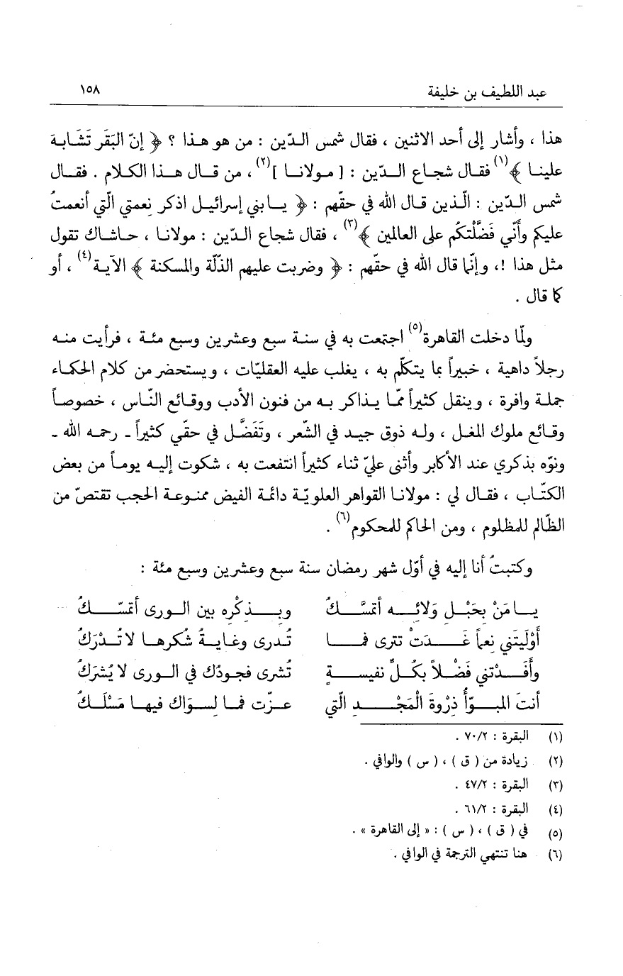 هذا، وأشار إلى أحد الاثنين، فقال شمس الدين: من هو هذا؟ " إن البقر تشابه علينا " فقال شجاع الدين: مولانا، من قال هذا الكلام. فقال شمس الدين: الذين قال الله في حقهم: " يا بني إسرائيل اذكر نعمتي التي أنعمت عليكم وأني فضلتكم على العالمين "، فقال شجاع الدين: مولانا، حاشاك تقول مثل هذا! وإنما قال الله في حقهم: " وضربت عليهم الذلة والمسكنة " الآية، أو كما قال.