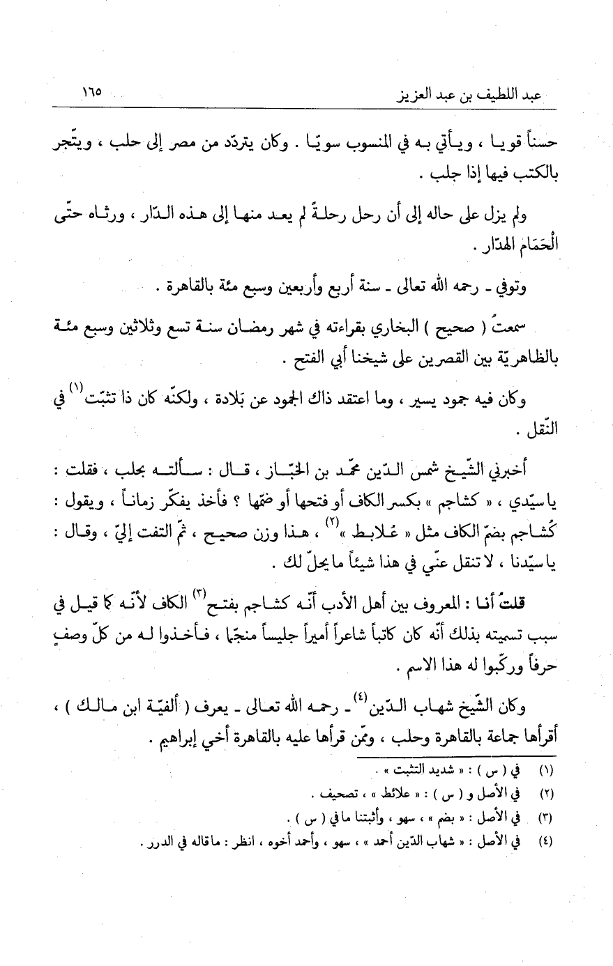 أخبرني الشيخ شمس الدين محمد بن الخباز، قال: سألته بحلب، فقلت: يا سيدي، كِشاجم بكسر الكاف أو فتحها أو ضمها؟ فأخذ يفكر زماناً، ويقول: كُشاجم بضم الكاف مثل علابط، هذا وزن صحيح، ثم التفت إلي، وقال: يا سيدنا، لا تنقل عني في هذا شيئاً ما يحل لك.