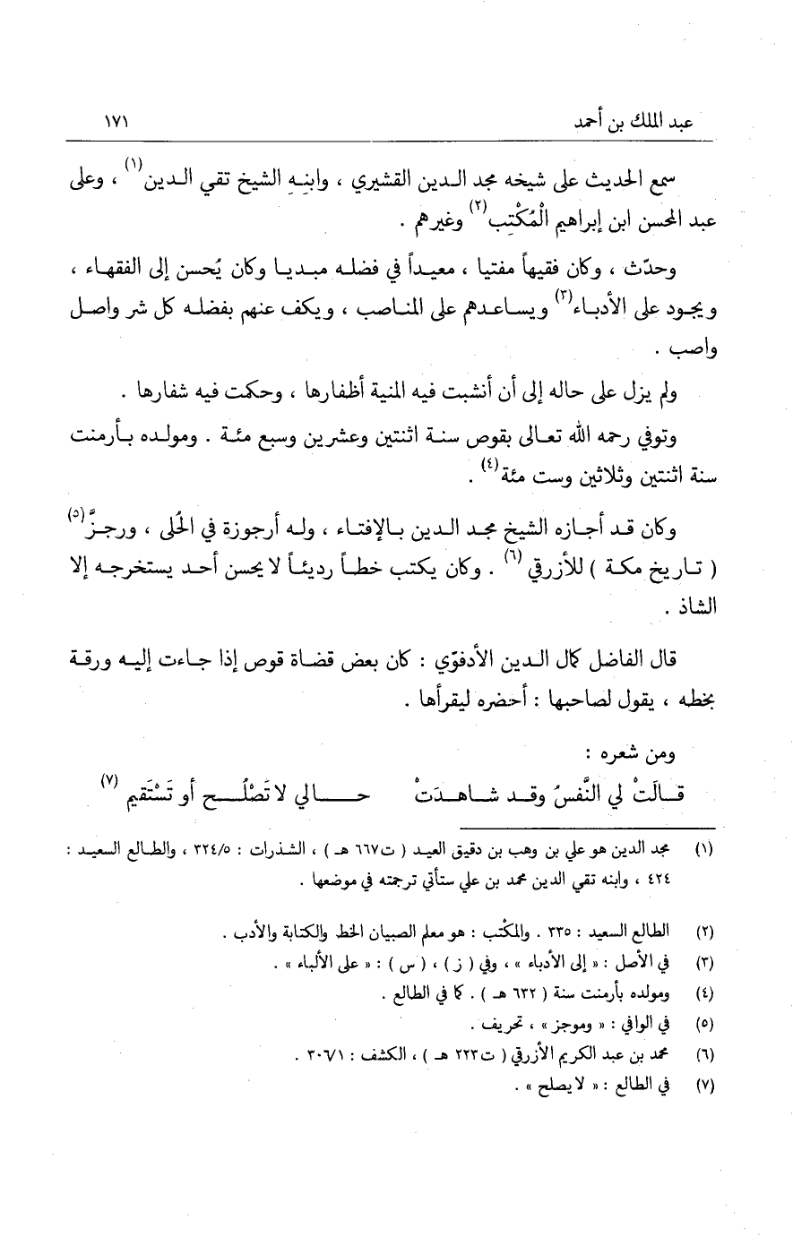 وكان قد أجازه الشيخ مجد الدين بالإفتاء، وله أرجوزة في الحلى، ورجز تاريخ مكة للأزرقي. وكان يكتب خطاً رديئاً لا يحسن أحد يستخرجه إلا الشاذ.