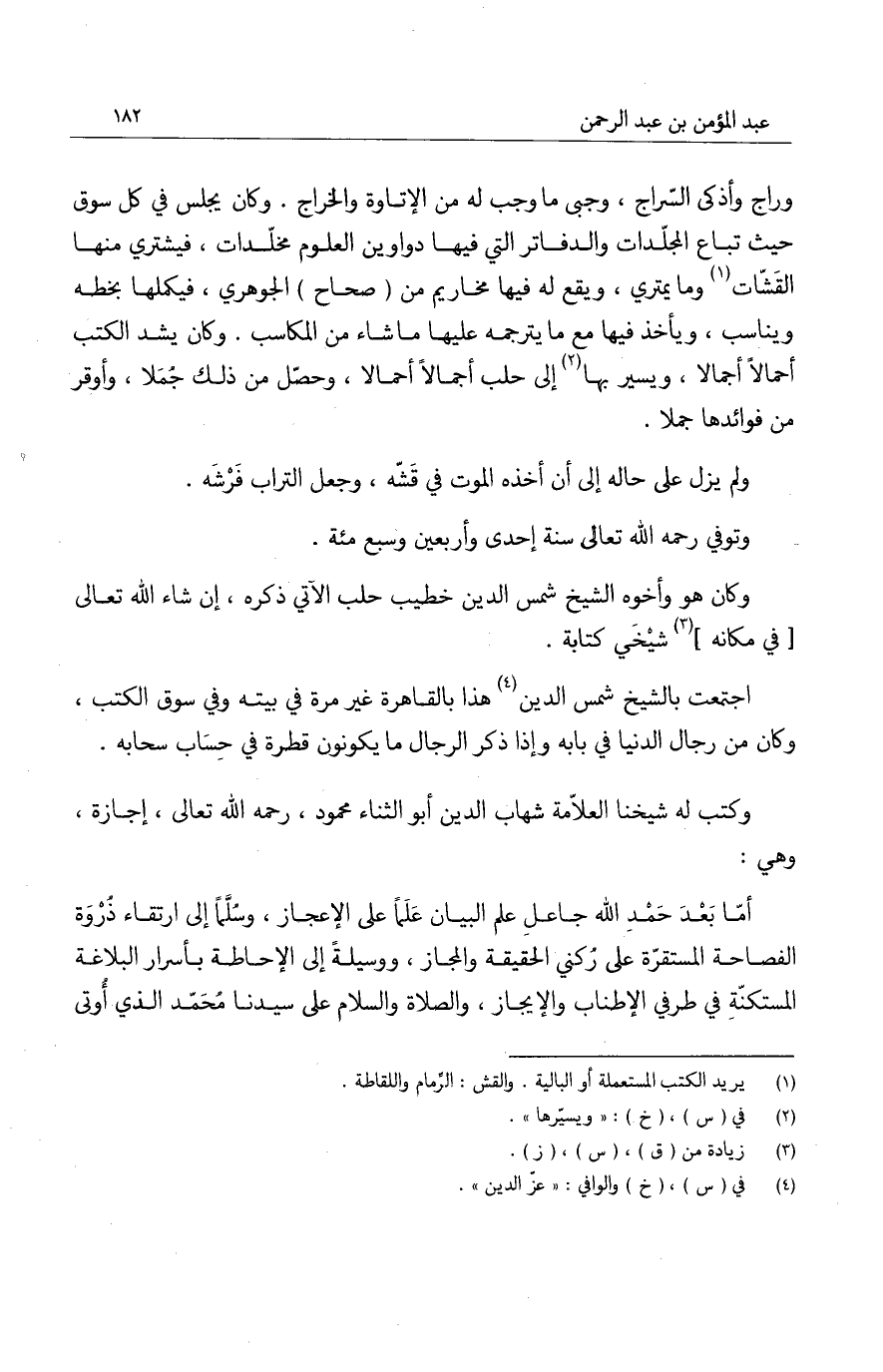 وراج وأذكى السراج، وجبى ما وجب له من الإتاوة والخراج. وكان يجلس في كل سوق حيث تباع المجلدات والدفاتر التي فيها دواوين العلوم مخلدات، فيشتري منها القشات وما يمتري، ويقع له فيها مخاريم من صحاح الجوهري، فيكملها بخطه ويناسب، ويأخذ فيها مع ما يترجمه عليها ما شاء من المكاسب. وكان يشد الكتب أحمالاً أجمالاً، ويسير بها إلى حلب أجمالاً أحمالاً، وحصل من ذلك جملاً، وأوفر من فوائدها جملاً.