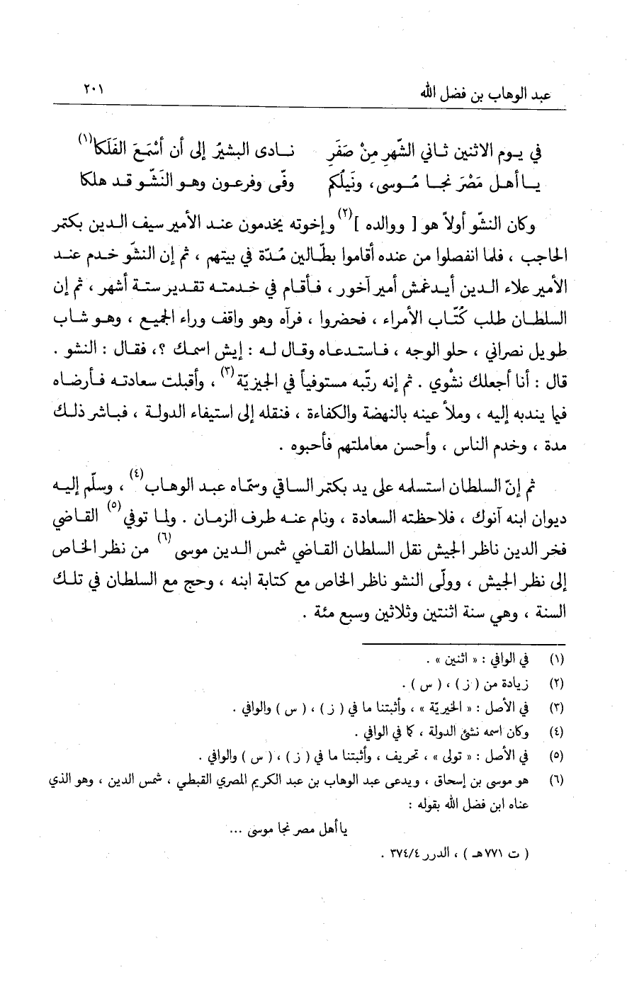 ثم إن السلطان استسلمه على يد بكتمر الساقي وسماه عبد الوهاب، وسلم إليه ديوان ابنه آنوك، فلاحظته السعادة، ونام عنه طرف الزمان. ولما توفي القاضي فخر الدين ناظر الجيش نقل السلطان القاضي شمس الدين موسى من نظر الخاص إلى نظر الجيش، وولى النشو ناظر الخاص مع كتابة ابنه، وحج مع السلطان في تلك السنة، وهي سنة اثنتين وثلاثين وسبع مئة.