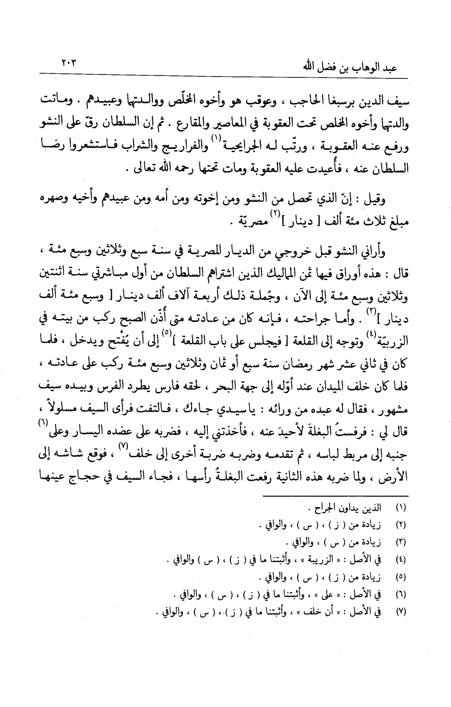 وأراني النشو قبل خروجي من الديار المصرية في سنة سبع وثلاثين وسبع مئة، قال: هذه أوراق فيها ثمن المماليك الذين اشتراهم السلطان من أول مباشرتي سنة اثنتين وثلاثين وسبع مئة إلى الآن، وجملة ذلك أربعة آلاف ألف دينار وسبع مئة ألف دينار. وأما جراحته، فإنه كان من عادته متى أذن الصبح ركب من بيته في الزربية وتوجه إلى القلعة فيجلس على باب القلعة إلى أن يفتح ويدخل، فلما كان في ثاني عشر شهر رمضان سنة سبع أو ثمان وثلاثين وسبع مئة ركب على عادته، فلا كان خلف الميدان عند أوله إلى جهة البحر، لحقه فارس يطرد الفرس وبيده سيف مشهور، فقال له عبده من ورائه: يا سيدي جاءك، فالتفت فرأى السيف مسلولاً، قال لي: فرفست البغلة لأحيد عنه، فأخذتني إليه، فضربه على عضده اليسار وعلى جنبه إلى مربط لباسه، ثم تقدمه وضربه ضربة أخرى إلى خلف، فوقع شاشة إلى الأرض، ولما ضربه هذه الثانية رفعت البغلة رأسها، فجاء السيف في حجاج عينها