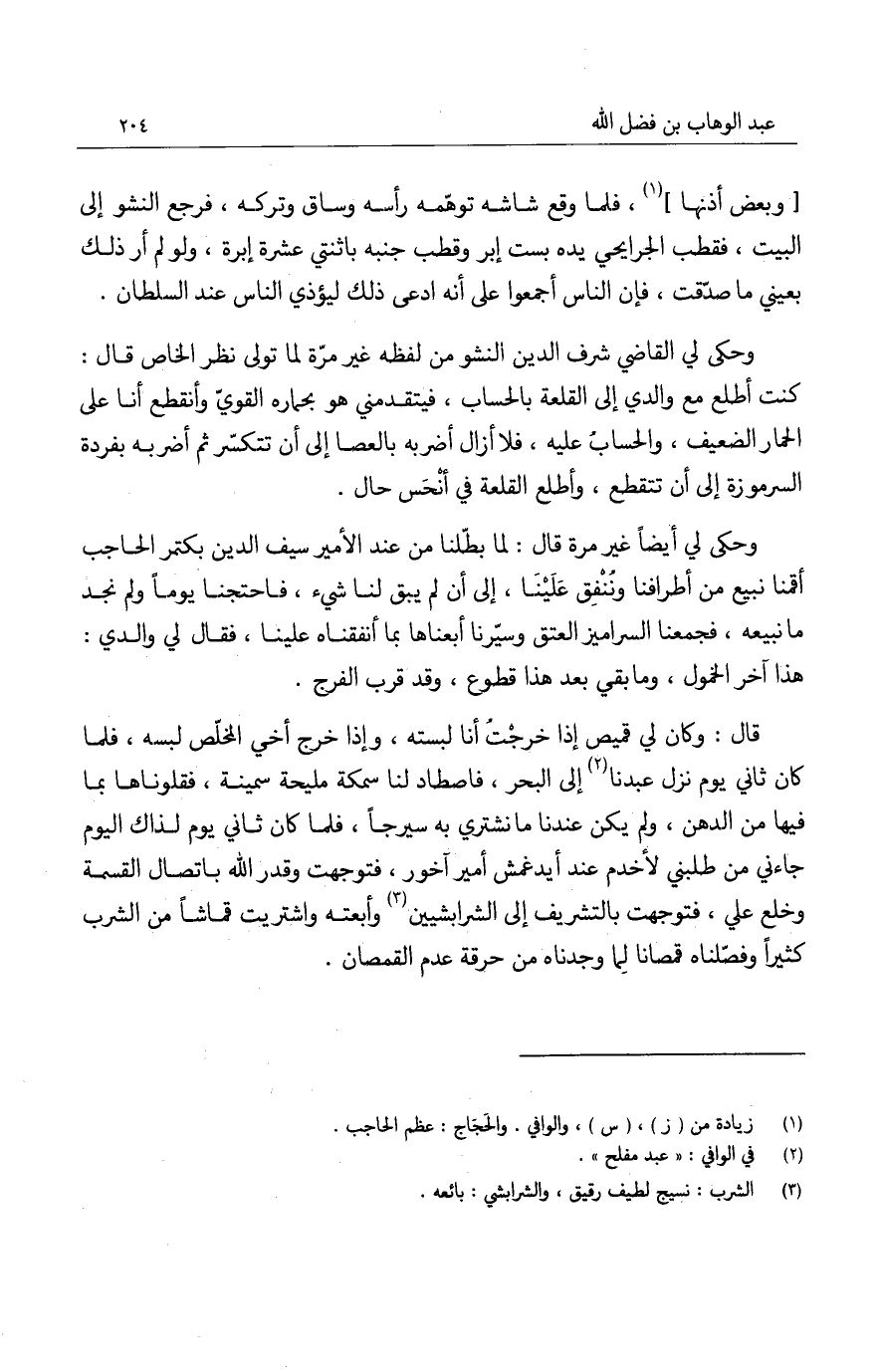قال: وكان لي قميص إذا خرجت أنا لبسته، وإذا خرج أخي المخلص لبسه، فلما كان ثاني يوم نزل عبدنا إلى البحر، فاصطاد لنا سمكة مليحة سمينة، فقلوناها بما فيها من الدهن، ولم يكن عندنا ما نشتري به سيرجاً، فلما كان ثاني يوم لذاك اليوم جاءني من طلبني لأخدم عند أيدغمش أمير آخور، فتوجهت وقدر الله باتصال القسمة وخلع علي، فتوجهت بالتشريف إلى الشرابشيين وأبعته واشتريت قماشاً من الشراب كثيراً وفصلناه قمصانا لما وجدناه من حرقة عدم القمصان.