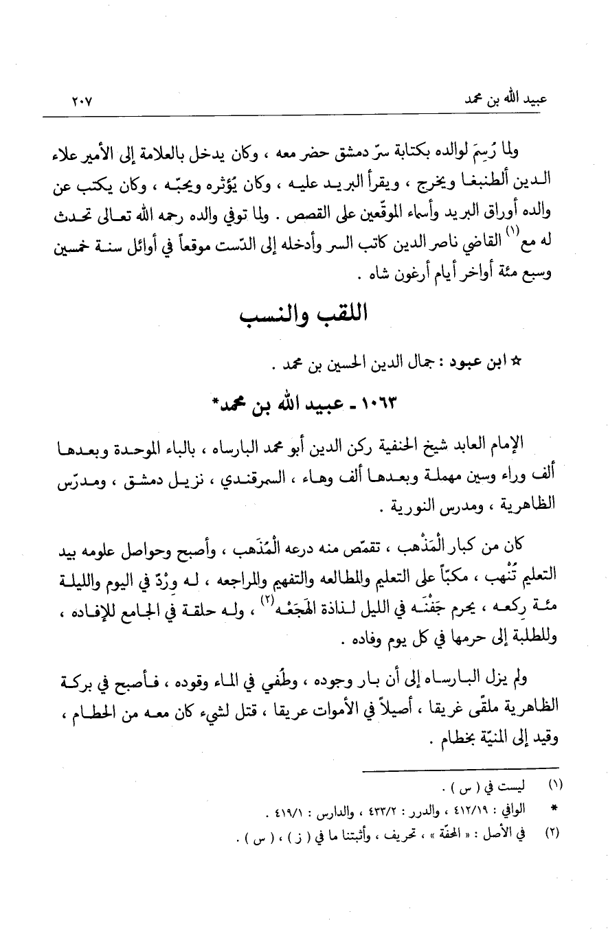 الإمام العابد شيخ الحنفية ركن الدين أبو محمد البارساه، بالباء الموحدة وبعدها ألف وراء وسين مهملة وبعدها ألف وهاء، السمرقندي، نزيل دمشق، ومدرس الظاهرية، ومدرس النورية.
