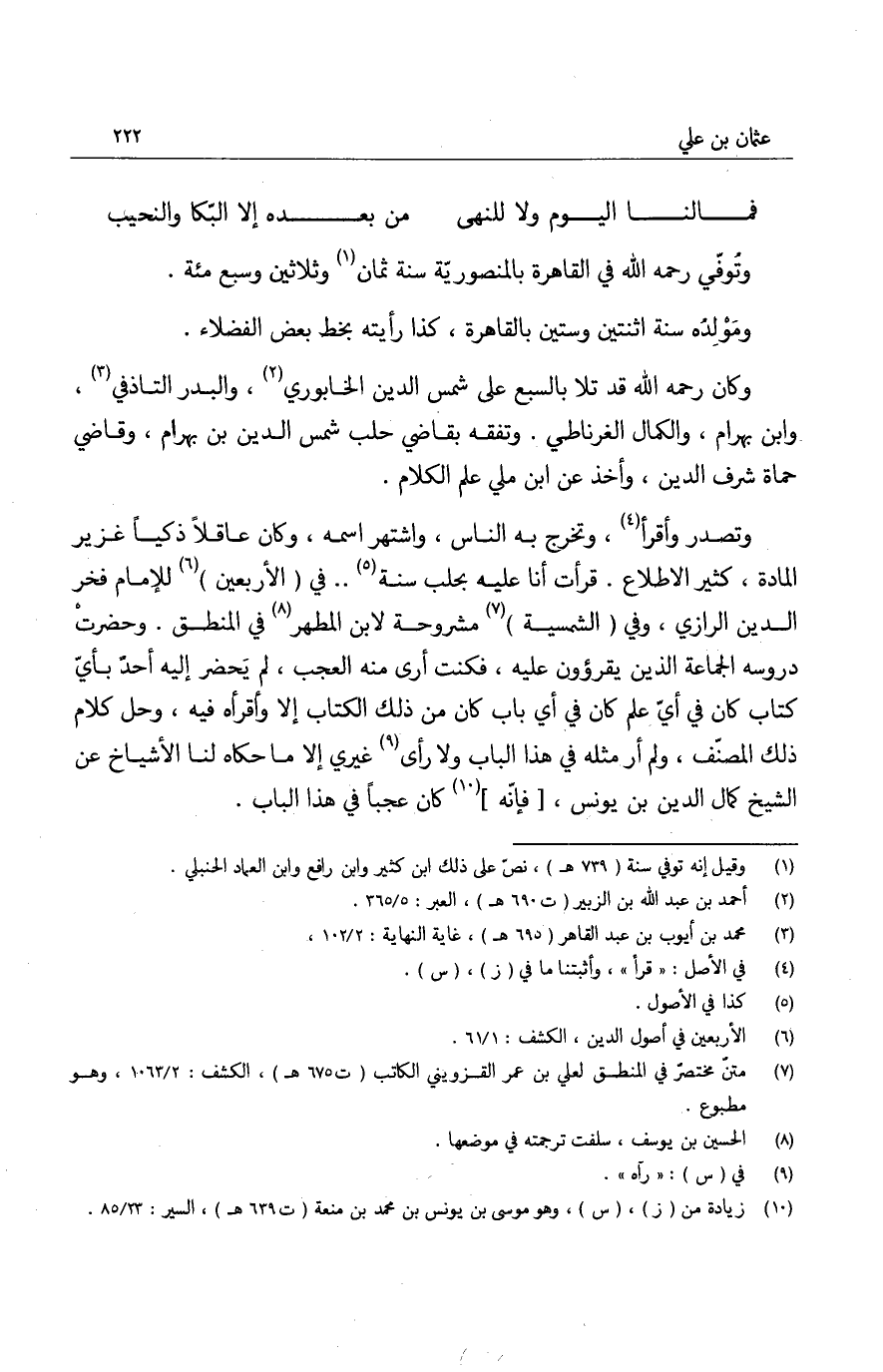 وتصدر وأقرأ، وتخرج به الناس، واشتهر اسمه، وكان عاقلاً ذكياً غزير المادة، كثير الإطلاع. قرأت أنا عليه بحلب سنة.. في الأربعين للإمام فخر الدين الرازي، وفي الشمسية مشروحة لابن المطهر في المنطق. وحضرت دروسه الجماعة الذين يقرؤون عليه، فكنت أرى منه العجب، لم يحضر إليه أحد بأي كتاب كان في أي علم كان في أي باب كان من ذلك الكتاب إلا وأقرأه فيه، وحل كلام ذلك المصنف، ولم أر مثله في هذا الباب ولا رأى غيري إلا ما حكاه لنا الأشياخ عن الشيخ كمال الدين بن يونس، فإنه كان عجباً في هذا الباب.