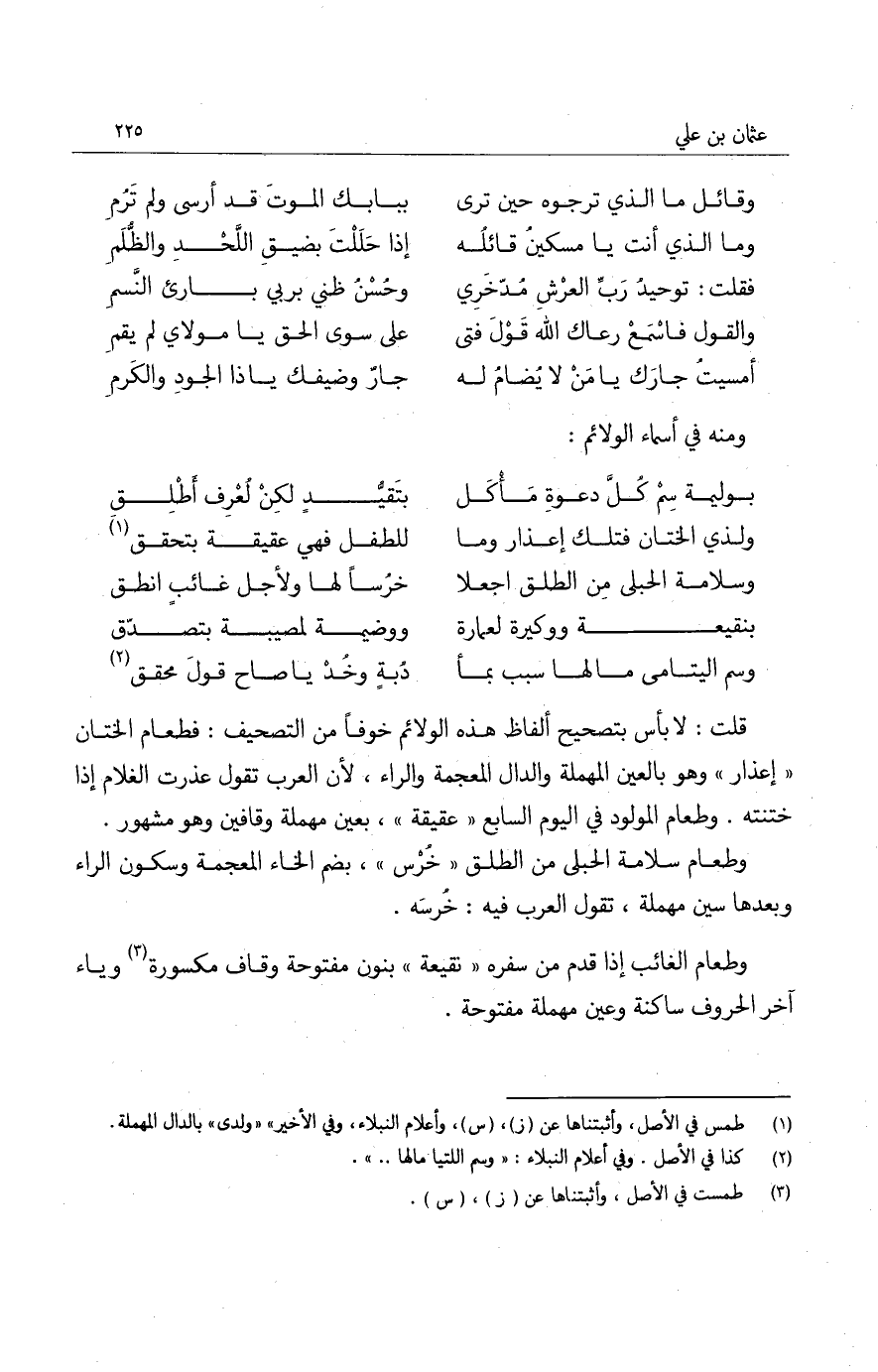قلت: لا بأس بتصحيح ألفاظ هذه الولائم خوفاً من التصحيف: فطعام الختان إعذار وهو بالعين المهملة والدال المعجمة والراء، لأن العرب تقول عذرت الغلام إذا ختنته. وطعام المولود في اليوم السابع عقيقة، بعين مهملة وقافين وهو مشهور.