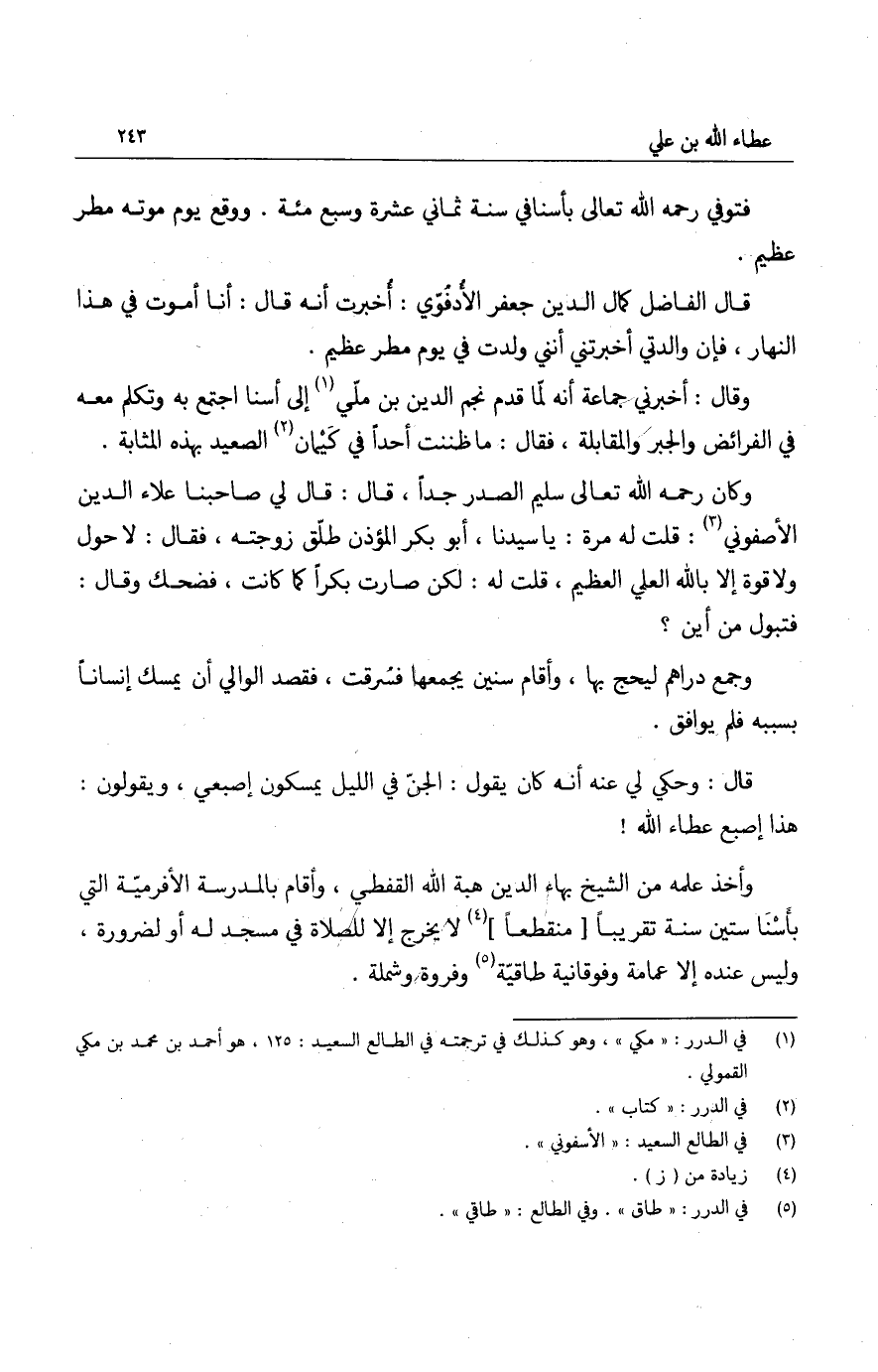 قال: وحكي لي عنه أنه كان يقول: الجن فلي الليل يمسكون إصبعي، ويقولون: هذا إصبع عطاء الله! وأخذ علمه من الشيخ بهاء الدين هبة الله القفطي، وأقام بالمدرسة الأفرمية التي بأسنا ستين سنة تقريباً منقطعاً لا يخرج إلا للصلاة في مسجد له أو لضرورة، وليس عنده إلا عمامة وفوقانية طاقية وفروة وشملة.