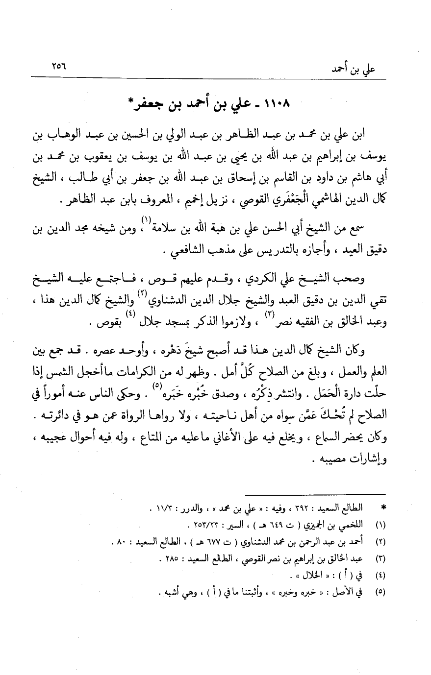 ابن علي بن محمد بن عبد الظاهر بن عبد الولي بن الحسين بن عبد الوهاب بن يوسف بن إبراهيم بن عبد الله بن يحيى بن عبد الله بن يوسف بن يعقوب بن محمد بن أبي هاشم بن داود بن القاسم بن إسحاق بن عبد الله بن جعفر بن أبي طالب، الشيخ كمال الدين الهاشمي الجعفري القوصي، نزيل إخميم، المعروف بابن عبد الظاهر.