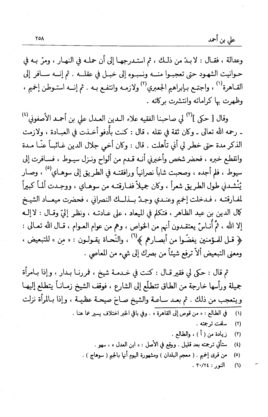وقال حكى لي صاحبنا الفقيه علاء الدين العدل علي بن أحمد الأصفوني رحمه الله تعالى وكان ثقة في نقله، قال: كنت بأدفو أخذت في العبادة، ولازمت الذكر مدة حتى خطر لي أني تأهلت. قال: وكان أخي جلال الدين غائباً عنا مدة وانقطع خبره، فحضر شخص وأخبرني أنه قدم من ألواح ونزل سيوط، فسافرت إلى سيوط، فلم أجده، وصحبت شاباً نصرانياً ورافقته في الطريق إلى سوهاي، وصار ينشدني طول الطريق شعراً، وكان جميلاً ففارقته من سوهاي، ووجدت ألماً كبيراً لمفارقته، فدخلت إخميم وعندي وجد بذلك النصرانين فحضرت ميعاد الشيخ كمال الدين بن عبد الظاهر، فتكلم في الميعاد، على عادته، ونظر إلي وقال: لا إله إلا الله، ثم أناس يعتقدون أنهم من الخواص، وهم من عوام العوام، قال الله تعالى: " قل للمؤمنين يغضوا من أبصارهم ". والنحاة يقولون: مِن للتبعيض، ومعنى التبعيض ألا ترف شيئاً من بصرك إلى شيء من المعاصي.