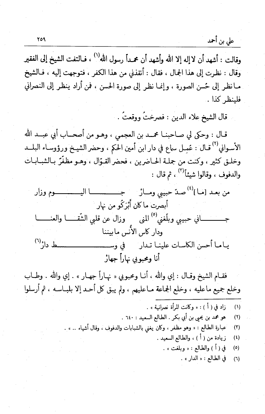 وقالت: أشهد أن لا إله إلا الله وأشهد أن محمداً رسول الله، فالتفت الشيخ إلى الفقير وقال: نظرت إلى هذا الجمال، فقال: أنقذني من هذا الكفر، فتوجهت إليه، فالشيخ ما نظر إلى حسن الصورة، وإنما نظر إلى صورة الحسن، فمن أراد ينظر إلى النصراني فلينظر كذا.