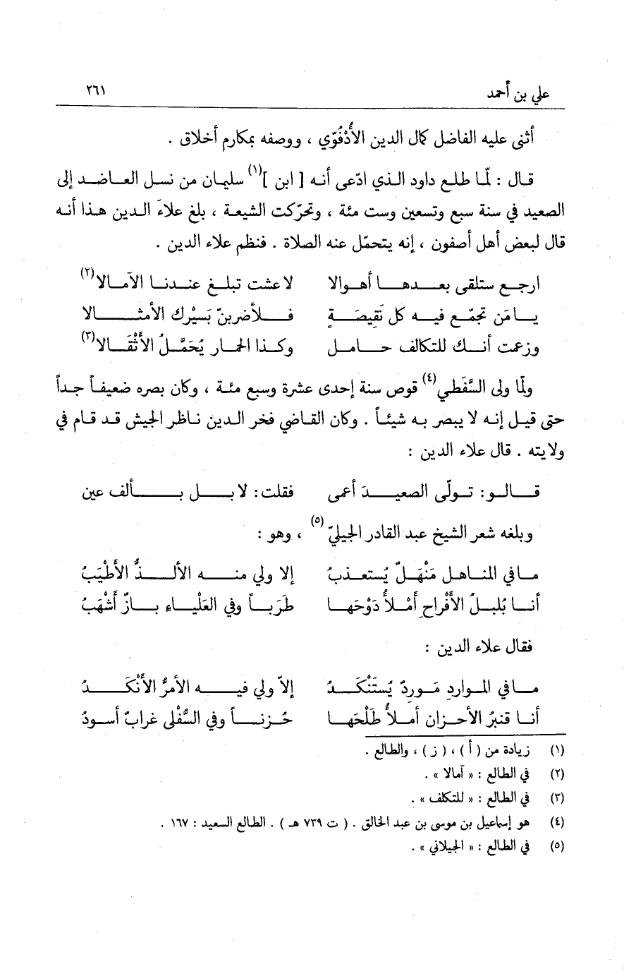 قال: لما طلع داود الذي ادعى أنه ابن سليمان من نسل العاضد إلى الصعيد في سنة سبع وتسعين وست مئة، وتحركت الشيعة، بلغ علاء الدين هذا أنه قال لبعض أهل أصفون، إنه يتحمل عنه الصلاة. فنظم علاء الدين.