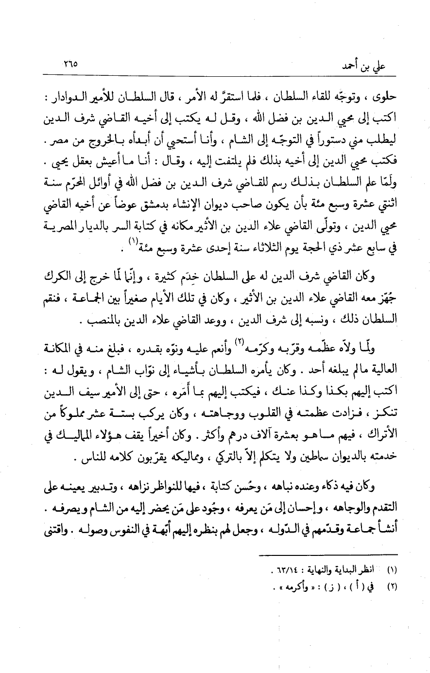 حلوى، وتوجه للقاء السلطان، فلما استقر له الأمر، قال السلطان للأمير الدوادار: اكتب إلى محيي الدين بن فضل الله، وقل له يكتب إلى أخيه القاضي شرف الدين ليطلب مني دستوراً في التوجه إلى الشام، وأنا أستحيي أن أبدأه بالخورج من مصر. فكتب محيي الدين إلى أخيه بذلك فلم يلتفت إليه، وقال: أنا ما أعيش بعقل يحيى. ولما علم السلطان بذلك رسم للقاضي شرف الدين بن فضل الله في أوائل المحرم سنة اثنتي عشرة وسبع مئة بأن يكون صاحب ديوان الإنشاء بدمشق عوضاً عن أخيه القاضي محيي الدين، وتولى القاضي علاء الدين بن الأثير مكانه في كتابة السر بالديار المصرية في سابع عشر ذي الحجة يوم الثلاثاء سنة إحدى عشرة وسبع مئة.
