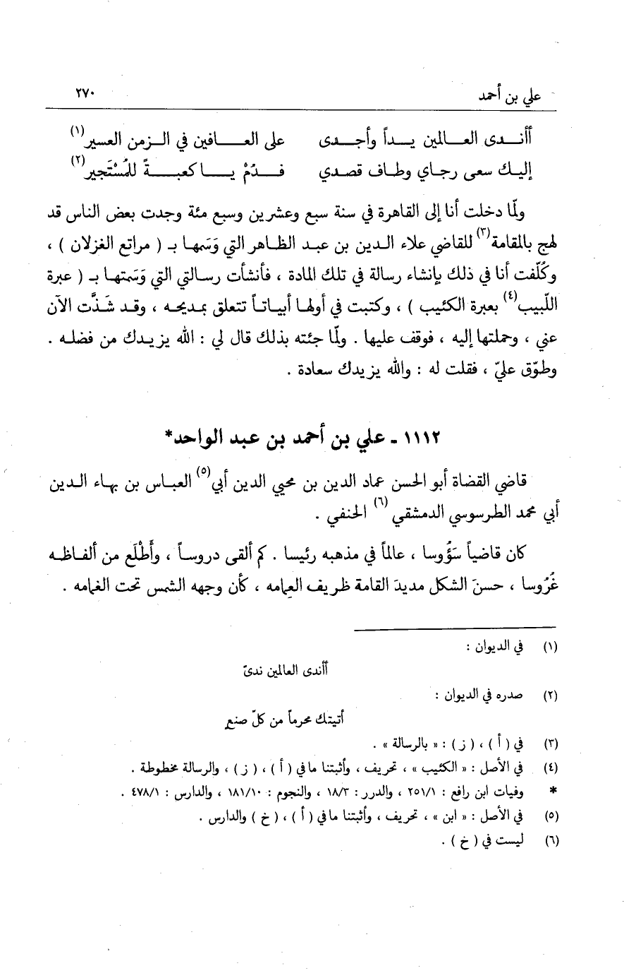 ولما دخلت أنا إلى القاهرة في سنة سبع وعشرين وسبع مئة وجدت بعض الناس قد لهج بالمقامة للقاضي علاء الدين بن عبد الظاهر التي وسمها ب؟ مراتع الغزلان، وكلفت أنا في ذلك بإنشاء رسالة في تلك المادة، فأنشأت رسالتي التي وسمتها ب؟ عبرة اللبيب بعبرة الكئيب، وكتبت في أولها أبياتاً تتعلق بمديحه، وقد شذت الآن عني، وحملتها إليه، فوقف عليها. ولما جئته بذلك قال لي: الله يزيدك من فضله. وطوق علي، فقلت له: والله يزيدك سعادة.