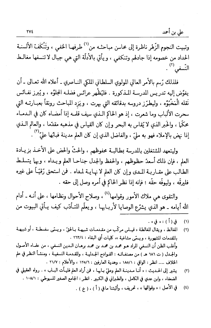 فلذلك رسم بالأمر العالي المولوي السلطاني الملكي الناصري أعلاه الله تعالى أن يفوض إليه تدريس المدرسة المذكورة. فليظهر عرائس فضله المجلوه، ويبرز نفائس نقله المخبوه، وليطرز دروسه بدقائقه التي بهرت، ويزد المباحث رونقاً بعبارته التي سحرت الألباب وما شعرت، إذ هو الحاكم الذي سيف قلمه إذا أمضاه كان في الدماء محكماً، والحبر الذي لا يقاس به البحر وإن كان القياس في مذهبه مقدماً، والعالم الذي إذا نهض بالإملاء فهو به ملي، والفاضل الذي إن كان العلم مدينة فبابها علي.