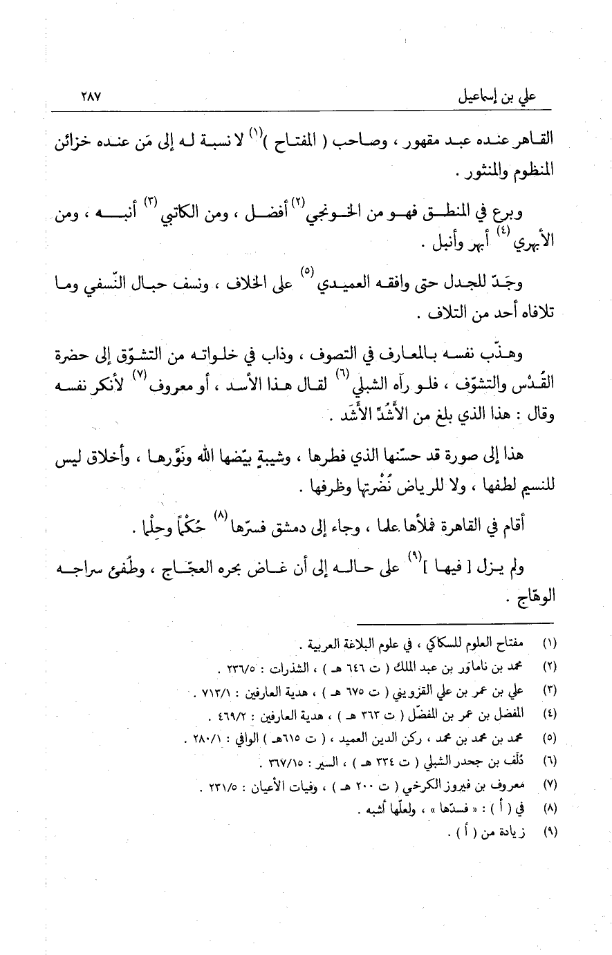 وهذب نفسه بالمعارف في التصوف، وذاب في خلواته من التشوق إلى حضرة القدس والتشوف، فلو رآه الشبلي لقال هذا الأسد، أو معروف لأنكر نفسه وقال: هذا الذي بلغ من الأشد الأشد.