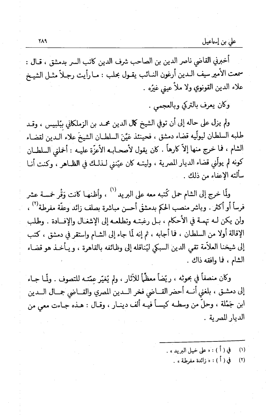 ولم يزل على حاله إلى أن توفي الشيخ كمال الدين محمد بن الزملكاني ببلبيس، وقد طلبه السلطان ليوليه قضاء دمشق، فحينئذ عين السلطان الشيخ علاء الدين لقضاء الشام، فما خرج منها إلا كارهاً. كان يقول لأصحابه الأعزة عليه: أخملني السلطان كونه لم يولني قضاء الديار المصرية، وليته كان عينني لذلك في الظاهر، وكنت أنا سألته الإعفاء من ذلك.