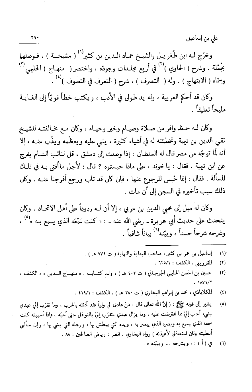 وكان له حظ وافر من صلاة وصيام وخير وحياء، وكان مع مخالفته للشيخ تقي الدين بن تيمية وتخطئته له في أشياء كثيرة، يثني عليه ويعظمه ويذب عنه، إلا أنه لما توجه من مصر قال له السلطان: إذا وصلت إلى دمشق، قل لنائب الشام يفرج عن ابن تيمية. فقال: يا خوند، على ماذا حبستموه؟ قال: لأجل ما أفتى به في تلك المسألة. فقال: إنما حبس للرجوع عنها، فإن كان قد تاب ورجع أفرجنا عنه. وكان ذلك سبب تأخيره في السجن إلى أن مات.