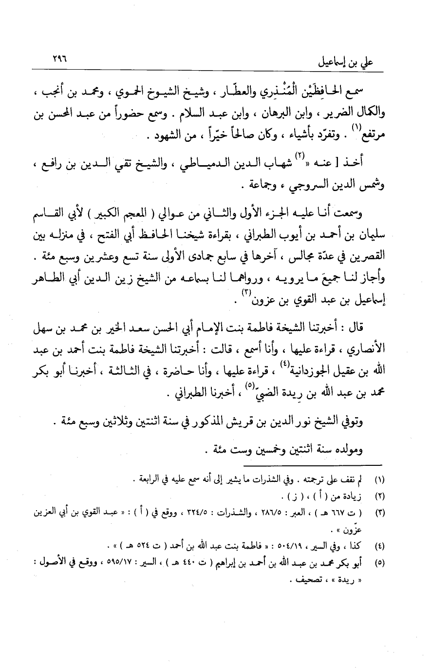 قال: أخبرتنا الشيخة فاطمة بنت الإمام أبي الحسن سعد الخير بن محمد بن سهل الأنصاري، قراءة عليها، وأنا أسمع، قالت: أخبرتنا الشيخة فاطمة بنت أحمد بن عبد الله بن عقيل الجوزدانية، قراءة عليها، وأنا حاضر، في الثالثة، أخبرنا أبو بكر محمد بن عبد الله بن ريدة الضبي، أخبرنا الطبراني.