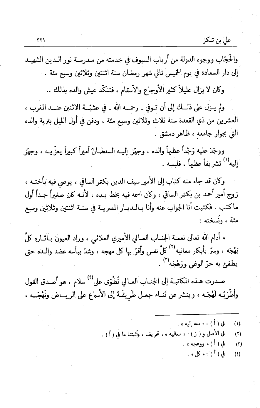 وكان قد جاء منه كتاب إلى الأمير سيف الدين بكتمر الساقي، يوصي فيه بأخته، زوج أمير أحمد بن بكتمر الساقي، وكان اسمه فيه بخط يده، لأنه كان صغيراً جداً أول ما كتب. فكتبت أنا الجواب عنه وأنا بالديار المصرية في سنة اثنتين وثلاثين وسبع مئة، ونسخته: " أدام الله تعالى نعمة الجناب العالي الأميري العلائي، وزاد العيون بآثاره كل بهجة، وسر بأبكار معانيه كل نفس وأقر بها كل مهجة، وشد ببأسه عضد والده حتى يطفئ به حر الوغى ورهجه.