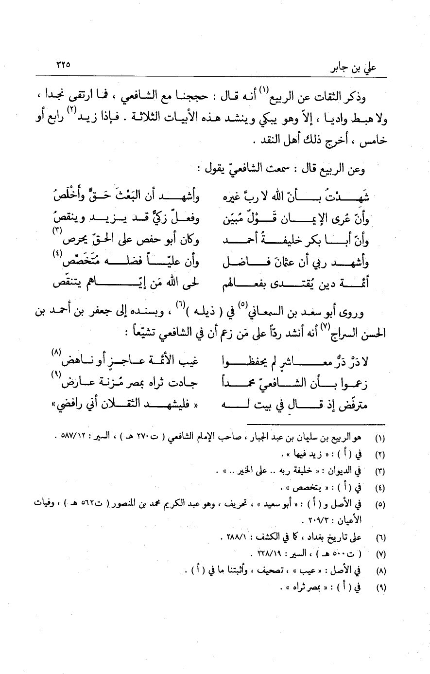وروى أبو سعد بن السمعاني في ذيله، وبسنده إلى جعفر بن أحمد بن الحسن السراج أنه أنشد رداً على من زعم أن في الشافعي تشيعاً: