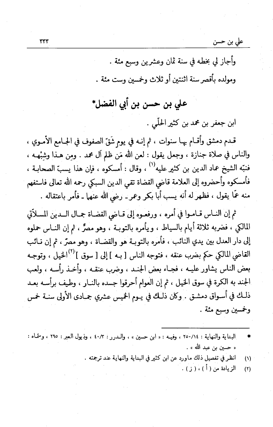 ثم إن الناس قاموا في أمره، ورفعوه إلى قاضي القضاة جمال الدين المسلاتي المالكي، فضربه ثلاثة أيام بالسياط، ويأمره بالتوبة، وهو مصر، ثم إن الناس حملوه إلى دار العدل بين يدي النائب، فأمره بالتوبة هو والقضاة، وهو مصر، ثم إن نائب القاضي المالكي حكم بضرب عنقه، فتوجه الناس به إلى سوق الخيل، وتوجه بعض الناس يشاور عليه، فجاء بعض الجند، وضرب عنقه، وأخذ رأسه، ولعب الجند به الكرة في سوق الخيل، ثم إن العوام أحرقوا جسده بالنار، وطيف برأسه بعد ذلك في أسواق دمشق. وكان ذلك في يوم الخميس عشري جمادة الأولى سنة خمس وخمسين وسبع مئة.