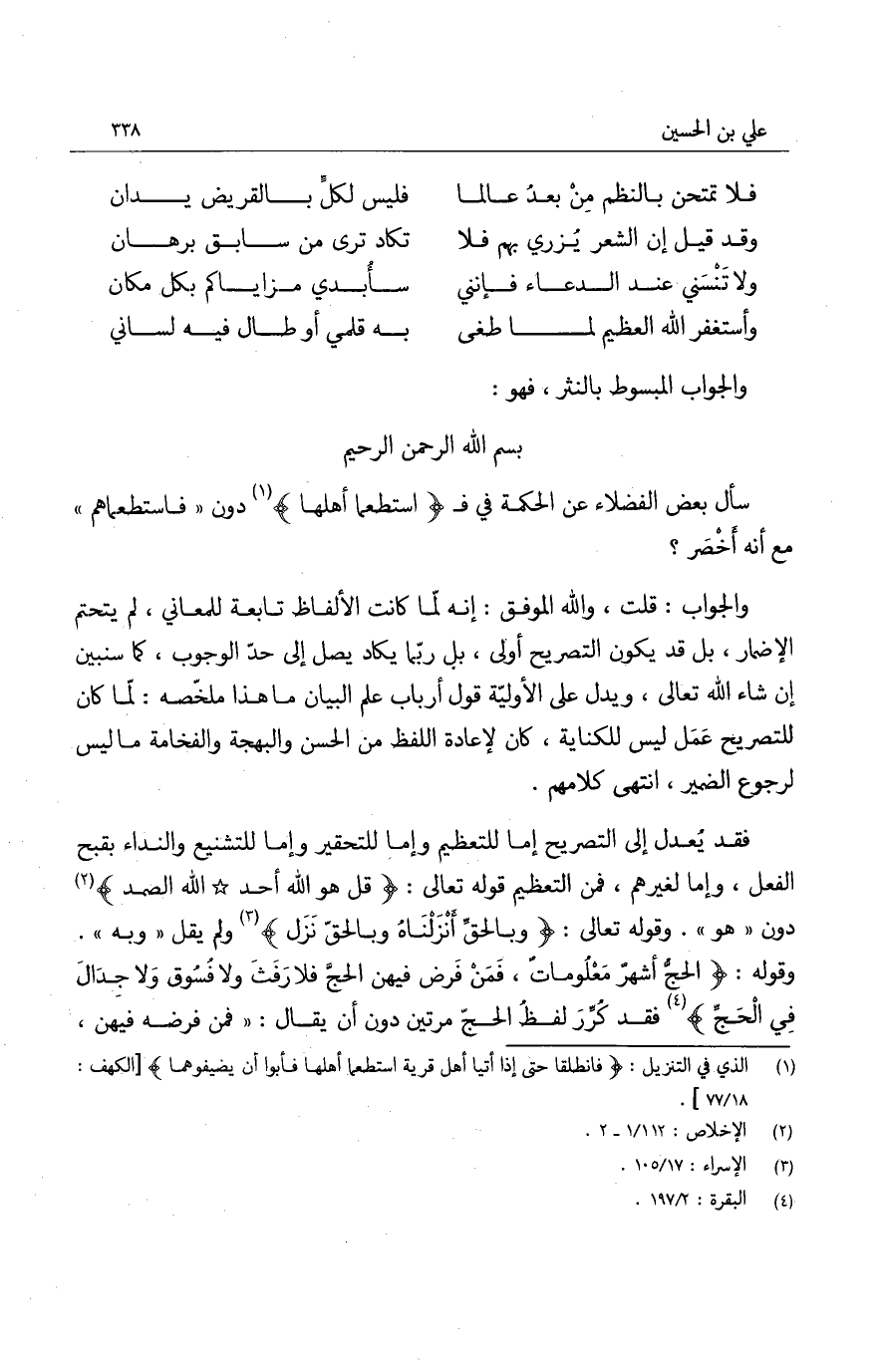 والجواب المبسوط بالنثر، فهو: بسم الله الرحمن الرحيم سأل بعض الفضلاء عن الحكمة في ف؟ " استطعما أهلها " دون فاستطعماهم مع أنه أخصر؟ والجواب: قلت: والله الموفق: إنه لما كانت الألفاظ تابعة للمعاني، لم يتحتم الإضمار، بل قد يكون التصريح أولى، بل ربما يكاد يصل إلى حد الوجوب، كما سنبين إن شار الله تعالى، ويدل على الأولية قول أرباب علم البيان ما هذا ملخصه: لما كان للتصريح عمل ليس للكناية، كان لإعادة اللفظ من الحسن والبهجة والفخامة ما ليس لرجوع الضمير، انتهى كلامهم.