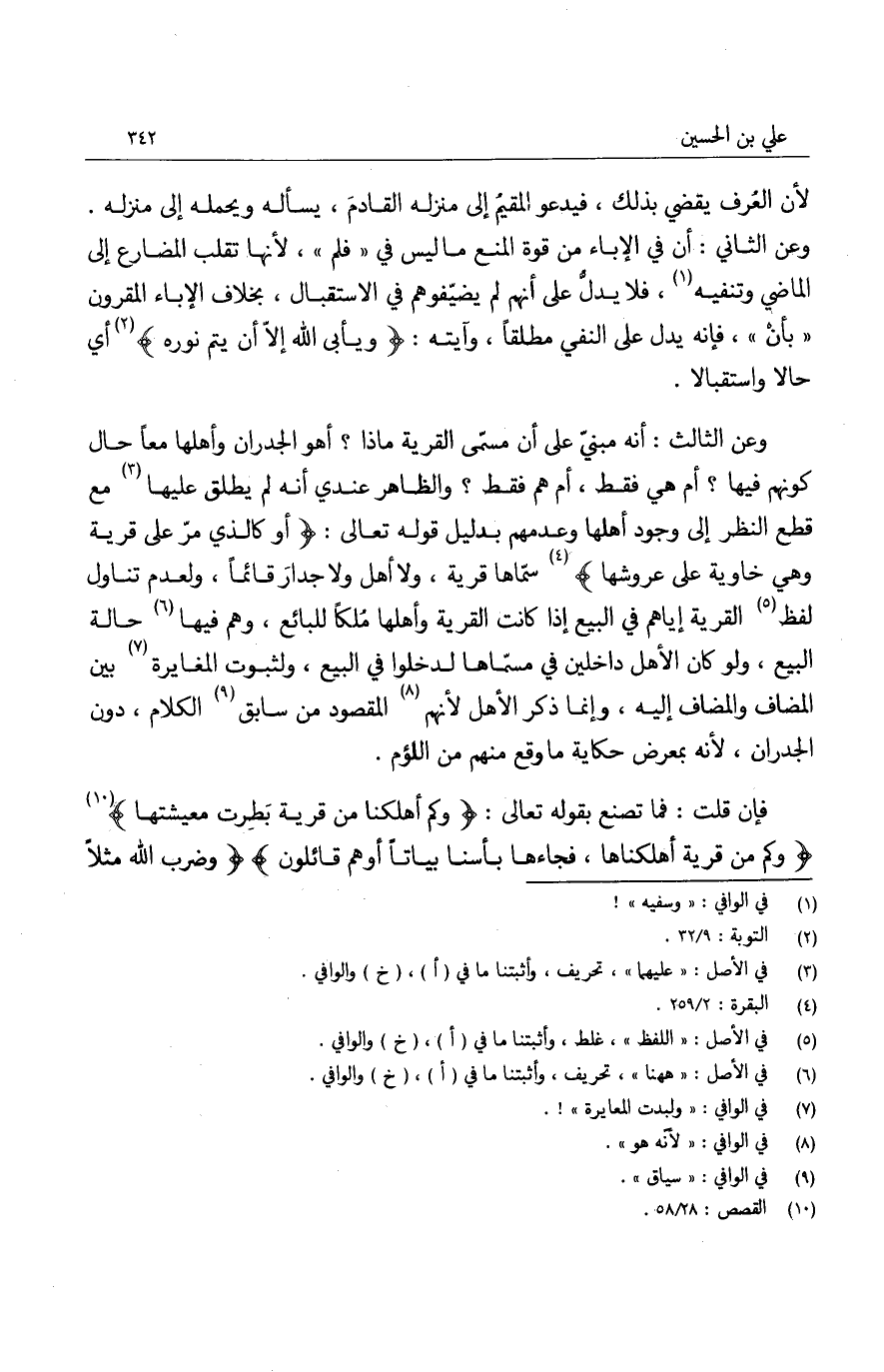 وعن الثالث: أنه مبني على أن مسمى القرية ماذا؟ أهو الجدران وأهلها معاً حال كونهم فيها؟ أم هي فقط، أم هم فقط؟ والظاهر عندي أنه لم يطلق عليها مع قطع النظر إلى وجود أهلها وعدمهم بدليل قوله تعالى: " أو كالذي مر علي قرية وهي خاوية على عروشها " سماها قرية، ولا أهل ولا جدار قائماً، ولعدم تناول لفظ القرية إياهم في البيع إذا كانت القرية وأهلها ملكاً للبائع، وهم فيها حالة البيع، ولو كان الأهل داخلين في مسماها لدخلوا في البيع، ولثبوت المغايرة بين المضاف والمضاف إليه، وإنما ذكر الأهل لأنهم المقصود من سابق الكلام، دون الجدران، لأنه بمعرض حكاية ما وقع منهم من اللؤم.