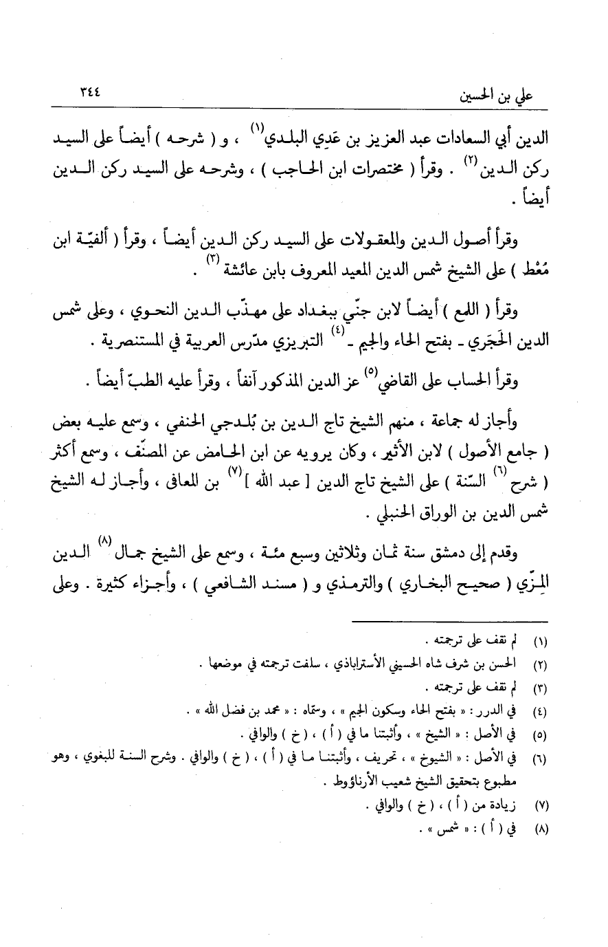 الدين أبي السعادات عبد العزيز بن عدي البلدي، وشرحه أيضاً على السيد ركن الدين. وقرأ مختصرات ابن الحاجب، وشرحه على السيد ركن الدين أيضاً.