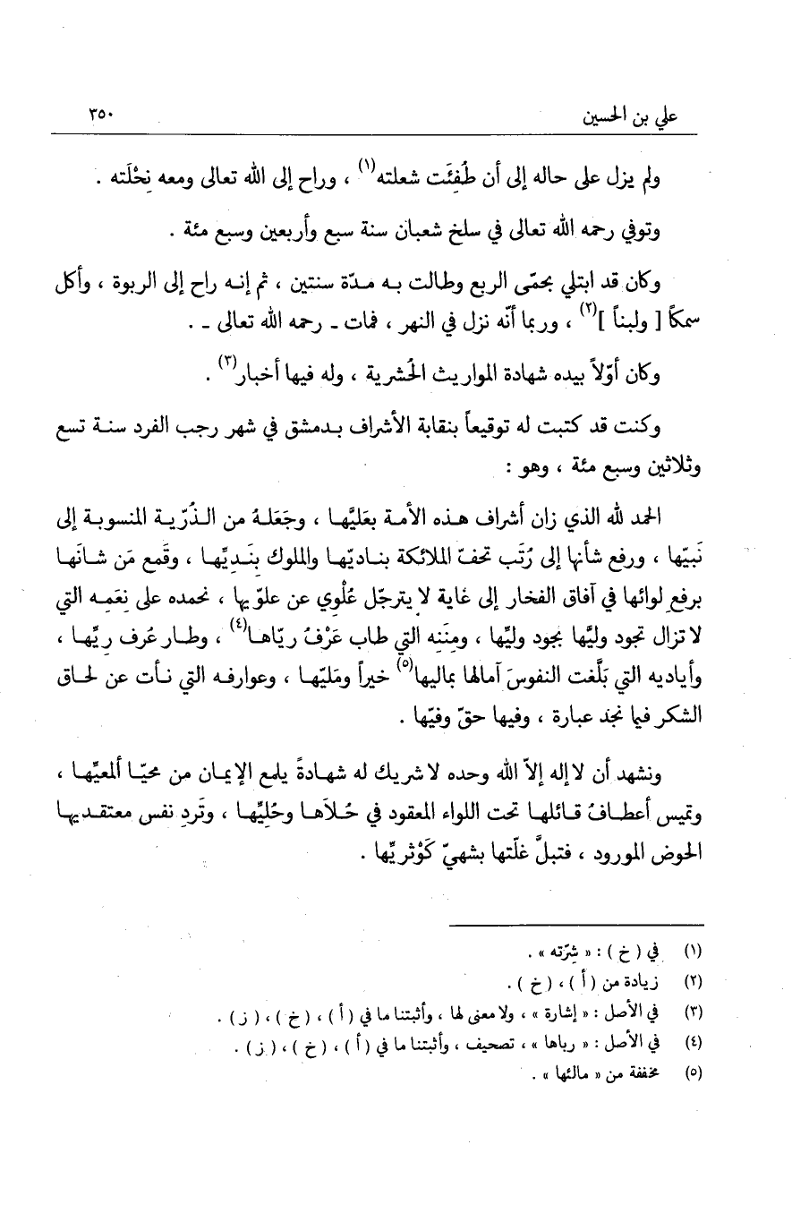 وكنت قد كتبت له توقيعاً بنقابة الأشراف بدمشق في شهر رجب الفرد سنة تسع وثلاثين وسبع مئة، وهو: الحمد لله الذي زان أشراف هذه الأمة بعليها، وجعله من الذرية المنسوبة إلى نبيها، ورفع شأنها إلى رتب تحف الملائكة بناديها والملوك بنديها، وقمع من شأنها برفع لوائها في آفاق الفخار إلى غاية لا يترجل علوي عن علويها، نحمده على نعمه التي لا تزال تجود وليها بجود وليها، ومننه التي طاب عرف رياها، وطار عرف ريها، وأياديه التي بلغت النفوس آمالها بماليها خيراً ومليها، وعوارفها التي نأت عن لحاق الشكر فيما نجد عبارة، وفيها حق وفيها.
