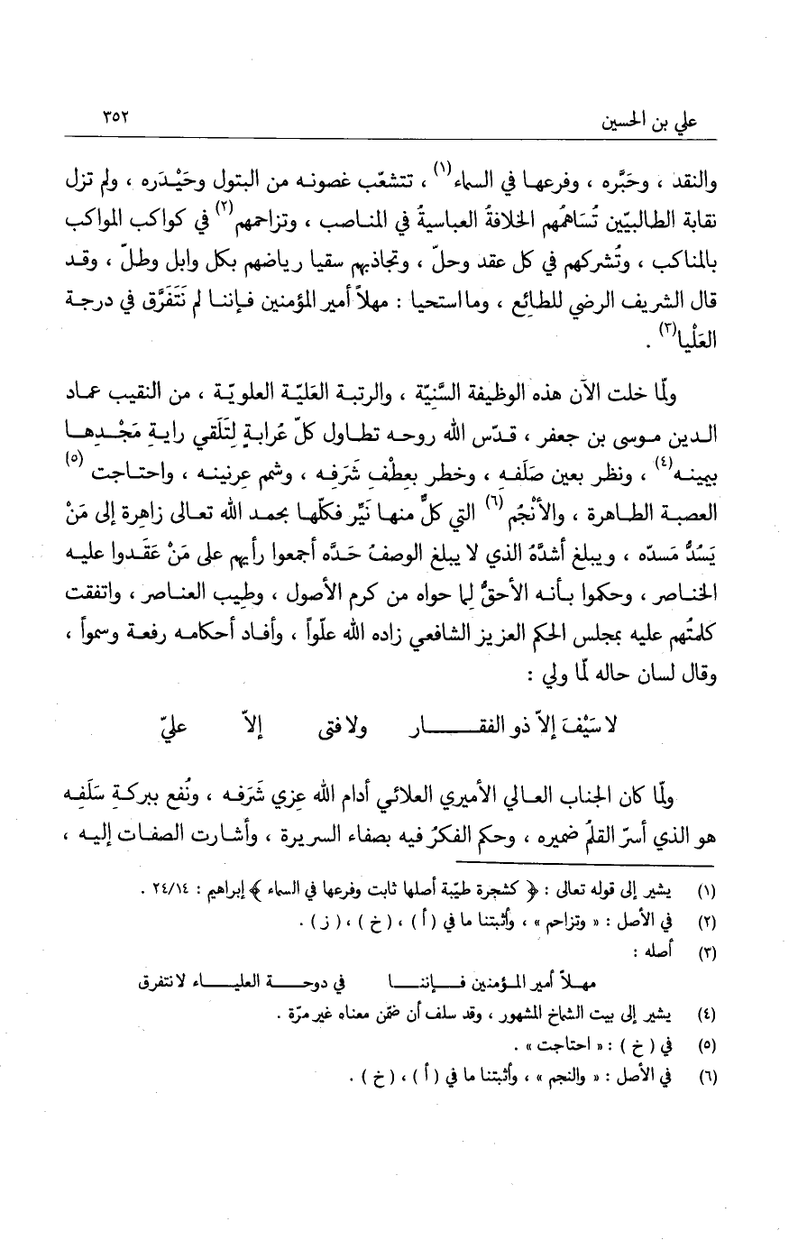 والنقد، وحبره، وفرعها في السماء، تتشعب غصونه من التبول وحيدره، ولم تزل نقابة الطالبيين تساهمهم الخلافة العباسية في المناصب، وتزاحمهم في كواكب المواكب بالمناكب، وتشركهم في كل عقد وحل، وتجاذبهم سقيا رياضهم بكل وابل وطل، وقد قال الشريف الرضي للطائع، وما استحيا، مهلاً أمير المؤمنين فإننا لم نتفرق في درجة العليا.