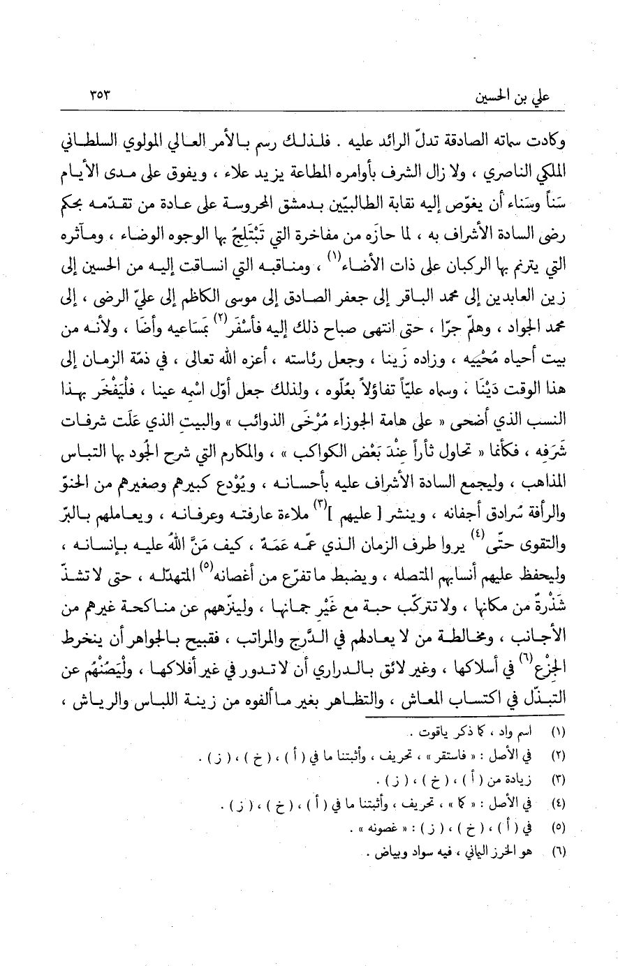 وكادت سماته الصادقة تدل الرائد عليه. فلذلك رسم بالأمر العالي المولوي السلطاني الملكي الناصري، ولا زال الشرف بأوامره المطاعة يزيد علاء، ويفوق على مدى الأيام سناً وسناء أن يغوص إليه نقابة الطالبيين بدمشق المحروسة على عادة من تقدمه بحكم رضى السادة الأشراف به، لما حازه من مفاخرة التي تبتلج بها الوجه الوضاء، ومآثره التي يترنم بها الركبان على ذات الأضاء، ومناقبة التي انساقت إليه من الحسين إلى زين العابدين إلى محمد الباقر إلى جعفر الصادق إلى موسى الكاظم إلى علي الرضى، إلى محمد الجواد، وهلم جرا، حتى انتهى صباح ذلك إليه فأسفر بمساعيه وأضا، ولأنه من بيت أحياه محييه، وزاده زيناً، وجعل رئاسته، أعزه الله تعالى، في ذمة الزمان إلى هذا الوقت ديناً، وسماه علياً تفاؤلاً بعلوه، ولذلك جعل أول اسمه عيناً، فليفخر بهذا النسب الذي أضحى على هامة الجوزاء مرخى الذوائب والبيت الذي علت شرفات شرفه، فكأنما تحاول ثأراً عند بعض الكواكب، والمكارم التي شرح الجود بها التباس المذاهب، وليجمع السادة الأشراف عليه بأحسانه، ويودع كبيرهم وصغيرهم من الحنو والرأفة سرادق أجفانه، وينشر عليهم ملاءة عارفته وعرفانه، ويعاملهم بالبر والتقوى حتى يروا طرف الزمان الذي عمه عمه، كيف من الله علي بإنسانه. وليحفظ عليهم أنسابهم المتصلة، ويضبط ما تفرع من أغصانه المتهدلة، حتى لا تشذ شذرة من مكانها، ولا تتركب حبة مع غير جمانها، ولينزهم عن مناكحة غيرهم من الأجانب، ومخالطة من لا يعادلهم في الدرج والمراتب، فقبيح بالجواهر أن ينخرط الجزع في أسلاكها، وغير لائق بالدراري أن لا تدور في غير أفلاكها، وليصنهم عن التبذل في اكتساب المعاش، والتظاهر بغير ما ألفوه من زينة اللباس والرياش.