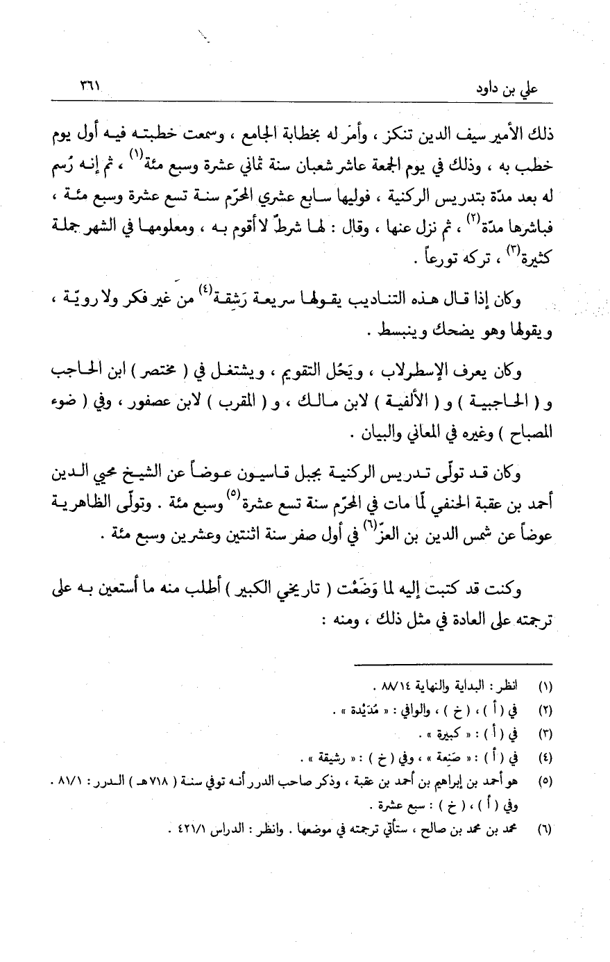 ذلك الأمير سيف الدين تنكز، وأمر له بخطابة الجامع، وسمعت خطبته في أول يوم خطب به، وذلك في يوم الجمعة عاشر شعبان سنة ثماني عشرة وسبع مئة، ثم إنه رسم له بعد مدة بتدريس الركنية، فوليها سابع عشري المحرم سنة تسع عشرة وسبع مئة. فباشرها مدة، ثم نزل عنها، وقال: لها شرط لا أقوم به، ومعلومها في الشهر جملة كثيرة، تركه تورعاً.