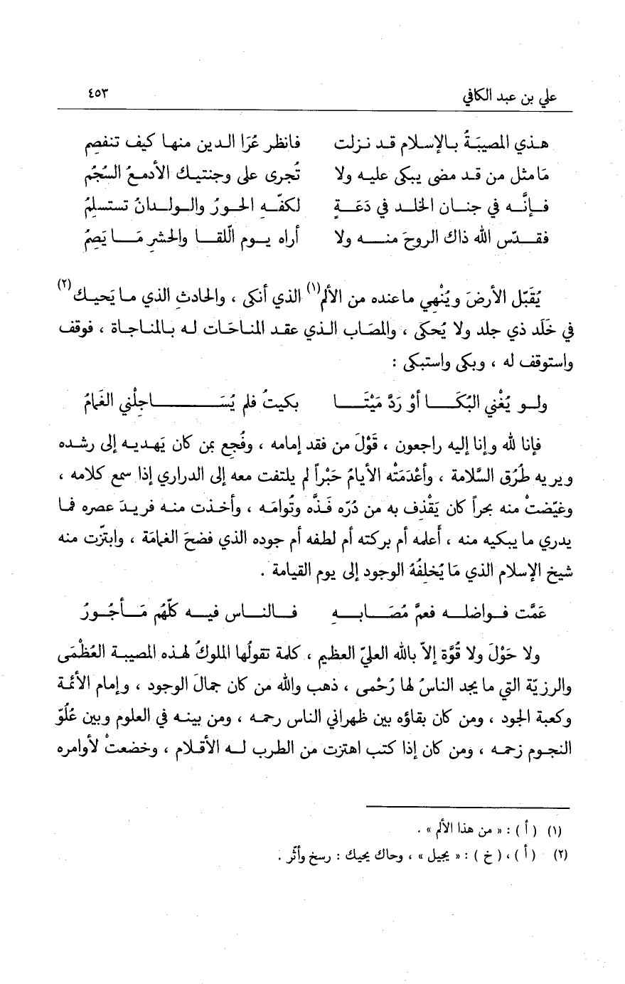 ويقسم المملوك أن مولانا وأخاه أدام الله أيامهما ما انفردا بهذه الرزية، ولا ابتليا دون الناس بهذه البلية، يا مولانا هذا ركن الإسلام قد انهدم، وهذا بحر الإيمان قد ارتدم فمصابه قد عم وما خص، وتحيف جناح الصبر وما حص، فالله يعين على ما أبلى ويمسك رمق القلوب فإنها عريت من جبة الصبر وما تطيق من الأحزان نبلاً، وما بقي غير الأخذ بالسنة في الصبر، والتمسك بآثار السلف الصالح ممن أودع أحبابه القبر: