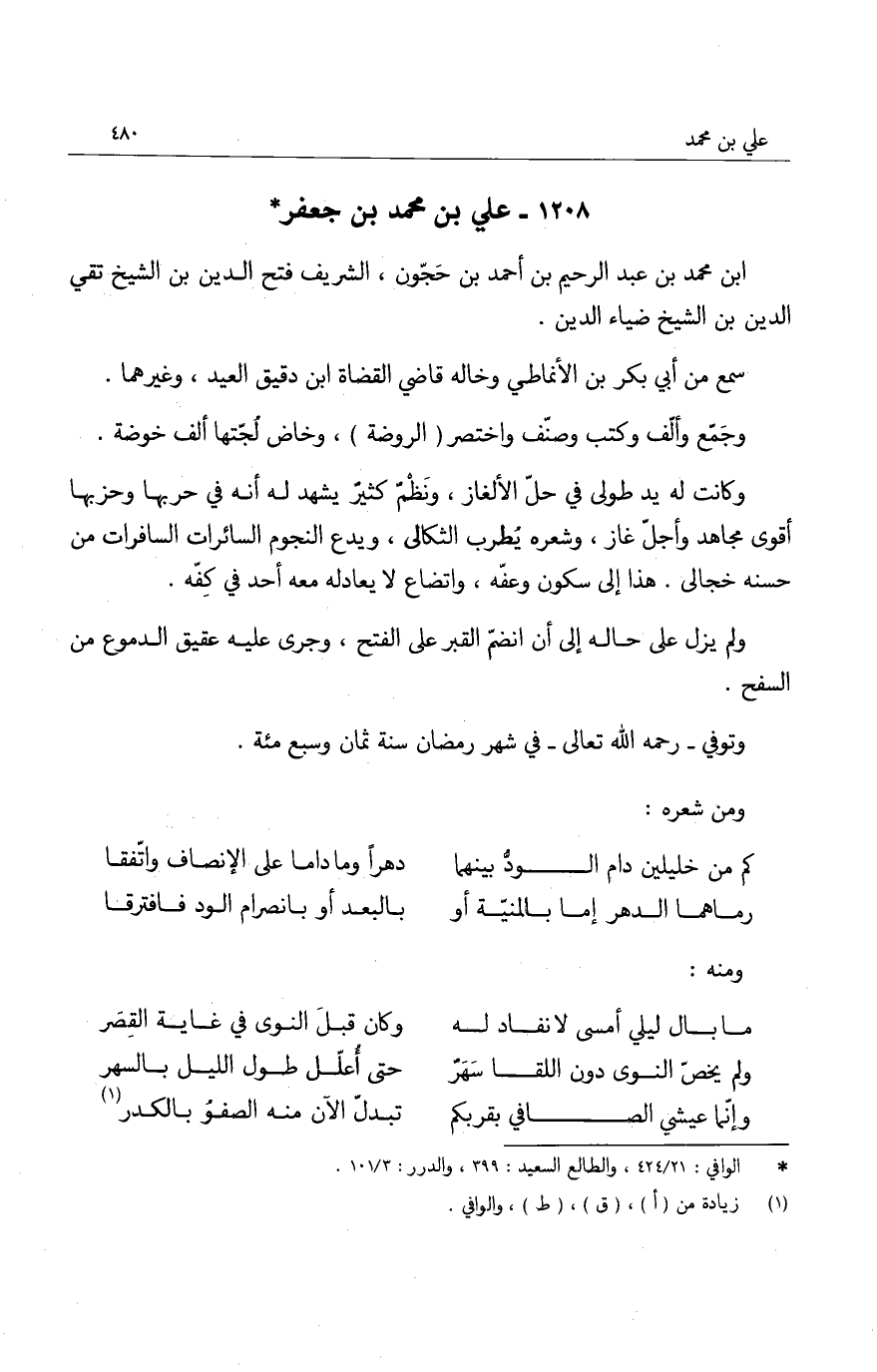 كان فاضلاً حاسباً فرضياً متأدباً مؤرخاً شاعراً، مصنفاً ماهراً، كثر التلاوة والعبادة والإنابة، غزير الوقار والمهابة.