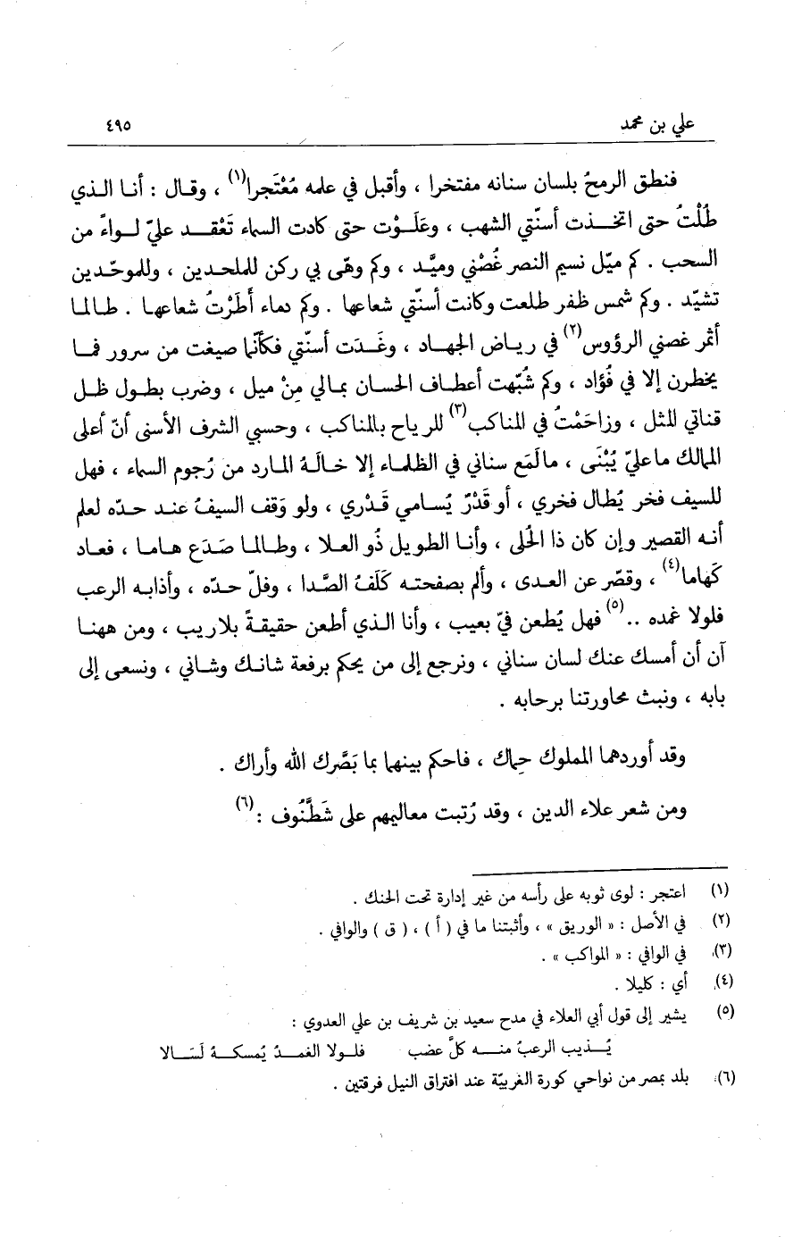 كان حسنة من حسنات الزمان، وبقية مما ترك أول الفضل والإحسان، ذا مروءة فاتت الواصف، وجود أخجل هتانه الغمام الواكف. تأذى من الدولة مرات، وما رجع عما له من العصبية والخير من كرات، يسدي الجميل إلى من يعرف والى من لا يعرف، ويتكل على الله تعالى فيما يتصرف بقلمه ويصرف. وكان وجيهاً في الدولة يعرف الناس قدره، ويعلمون أن المروءة لا تنزل إلا في قلبه، ولا تسكن إلا صدره.