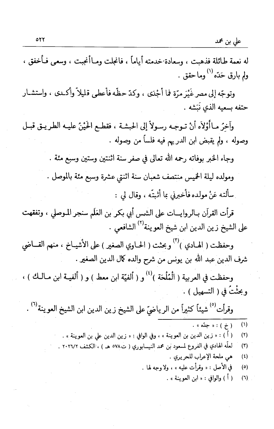 وتوفي والده وهو صغير، خلف نعمة طائلة، فاستولى عليها بيت شيخ البلد بالموصل كمال الدين، ومعين الدين بن الريحاني ولم يطلعوه منها إلا على القليل، وانتشأ يتيماً وهو بنفسه وهمته يجتهد ويشتغل في العلم، ولم يكن له من يحرضه على ذلك، ثم إنه لما اشتد تسلم مقداراً يسراً من ماله من بيت شيخ البلد، وسافر به إلى الشام ومصر، وحصل من ذلك ثروة عظيمة، ثم ذهبت.