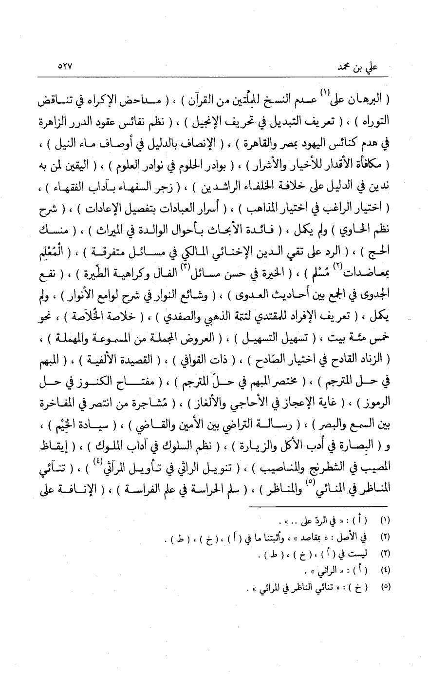الضيافة، تصاريف الدهر في تعاريف الزجر، افتقاد الخرائد المواهر في انتقاد فرائد الجواهر، تقرير الأبحاث في خواص المولدات الثلاث، اختباء الاختبار، الإساة بأدواء النسا والباه، اقتناع الحذاق في أنواع الأوفاق، بسط الفوائد ي شرح حساب القواعد، شرح الإسعردية في الحساب، المناسخات المصرية، الأجوبة القاهرية، المناسخات الحلبية، الأجوبة الحلبية، المسألة الحجموية، الأجوبة الحموية، الأجوبة الموصلية، الترسلات الشامية، الأجوبة الشامية، لم تكمل رسالة النصح العلوي على لسان الجامع الأموي، إخلاص الخواص. تمت.