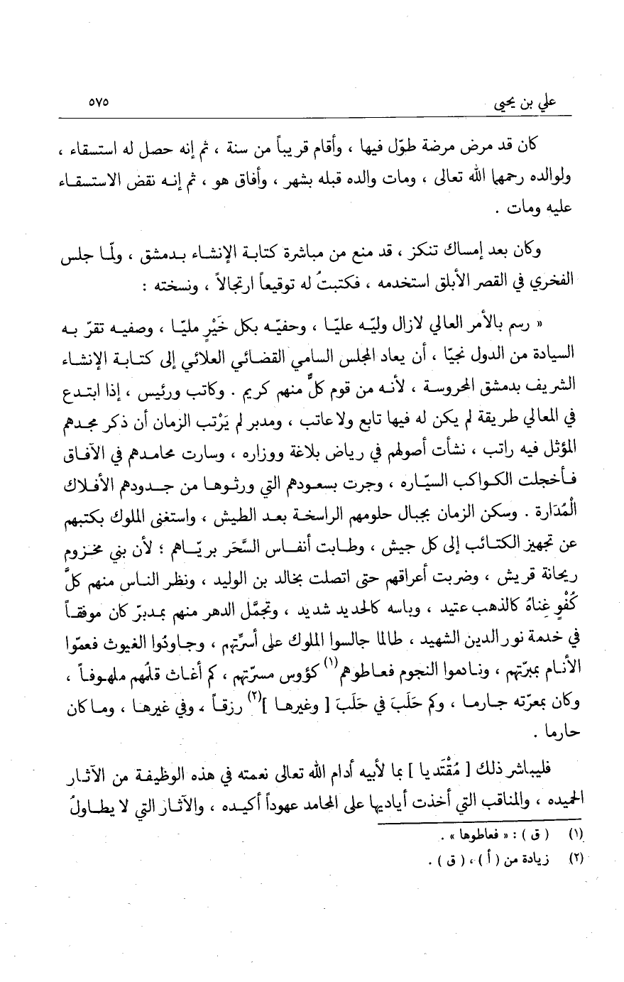 الزمان قصورها المشيدة، والفضائل التي هي في الديوان بيت القصيدة، حتى تجملت به الدنيا، وأقسم الفضلاء أن القاضي الفاضل لم يقض نحباً، وأنه يحيا، مهتدياً بسمت عمه خلد الله سعوده، فإنه لهذه الدنيا شرف، ولهذه الأيام من أقلامه غاب لا يدخلها ليث خطب إلا انهزم وانصرف، ولهذه الأيام من تواقيعه جنات فيها حور الأرزاق، تأوي إلى غرف، وليدبج بأقلامه المهارق التي تمطرها البلاغة، وتعلم الناس بمعانيها كيف يكون السحر وبألفاظها صناعة الصياغة. والوصايا عنهم يؤخذ بيانها، ومنهم يشير إلى الهدى بنانها فما ينبه عليها، ولا يدل على الطريق الآخذة إليها، وتقوى الله هي العمدة، والذخر العتيد عند الشدة، فلا ينسى فيها نصيبه، ولا يقدم غيرها في المهمات كتيبة، والخط الكريم أعلاه حجة في العمل بمقتضاه، إن شاء الله تعالى.