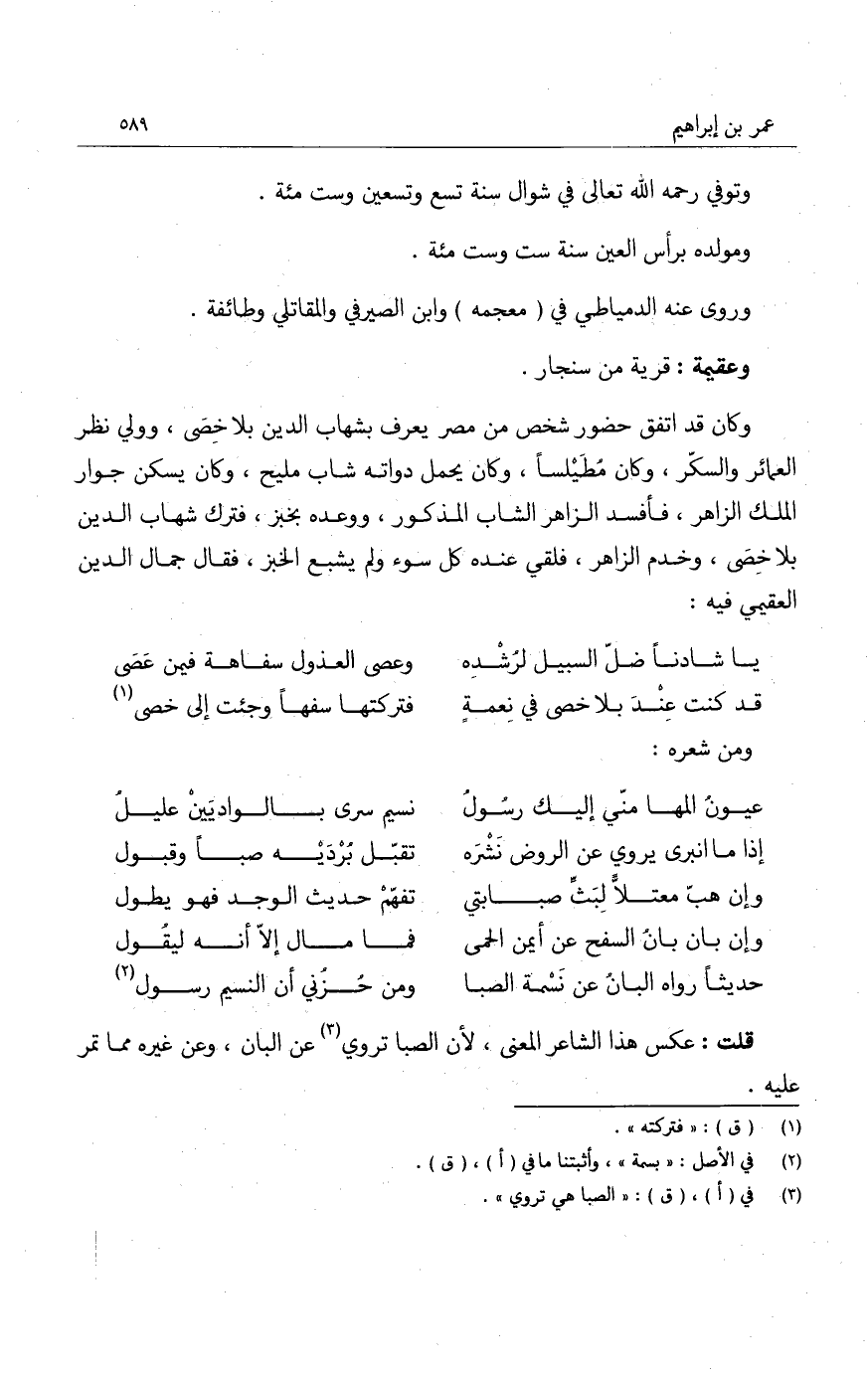 قلت: عكس هذا الشاعر المعنى، لأن الصبا تروي عن البان، وعن غيره مما تمر عليه.