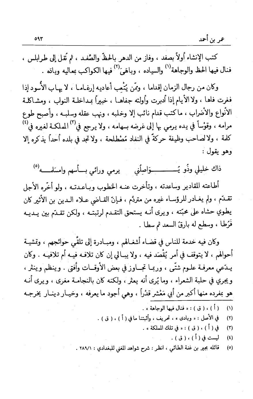 وكن من رجال الزمان إقداماً، وممن يتعب أعاديه إرغاماً، لا يهاب الأسود إذا فغرت فاها، ولا الأيام إذا أدبرت وأولته جفاها، خبيراً بمداخلة النواب، ومشاكلة الأنواع والأضراب، ما كتب قدام نائب إلا وخلبه، ونهب عقله وسلبه، وأصبح طوع مرامه، وقوساً في يده يرمي بها إلى غرضه بسهامه، ولا يرجع في المملكة لغيره في كلمة، ولا لصاحب وظيفة حركة في النفاد مصطلحة، ولا تجد في بلده أحداً يذكره إلا وهو يقول.