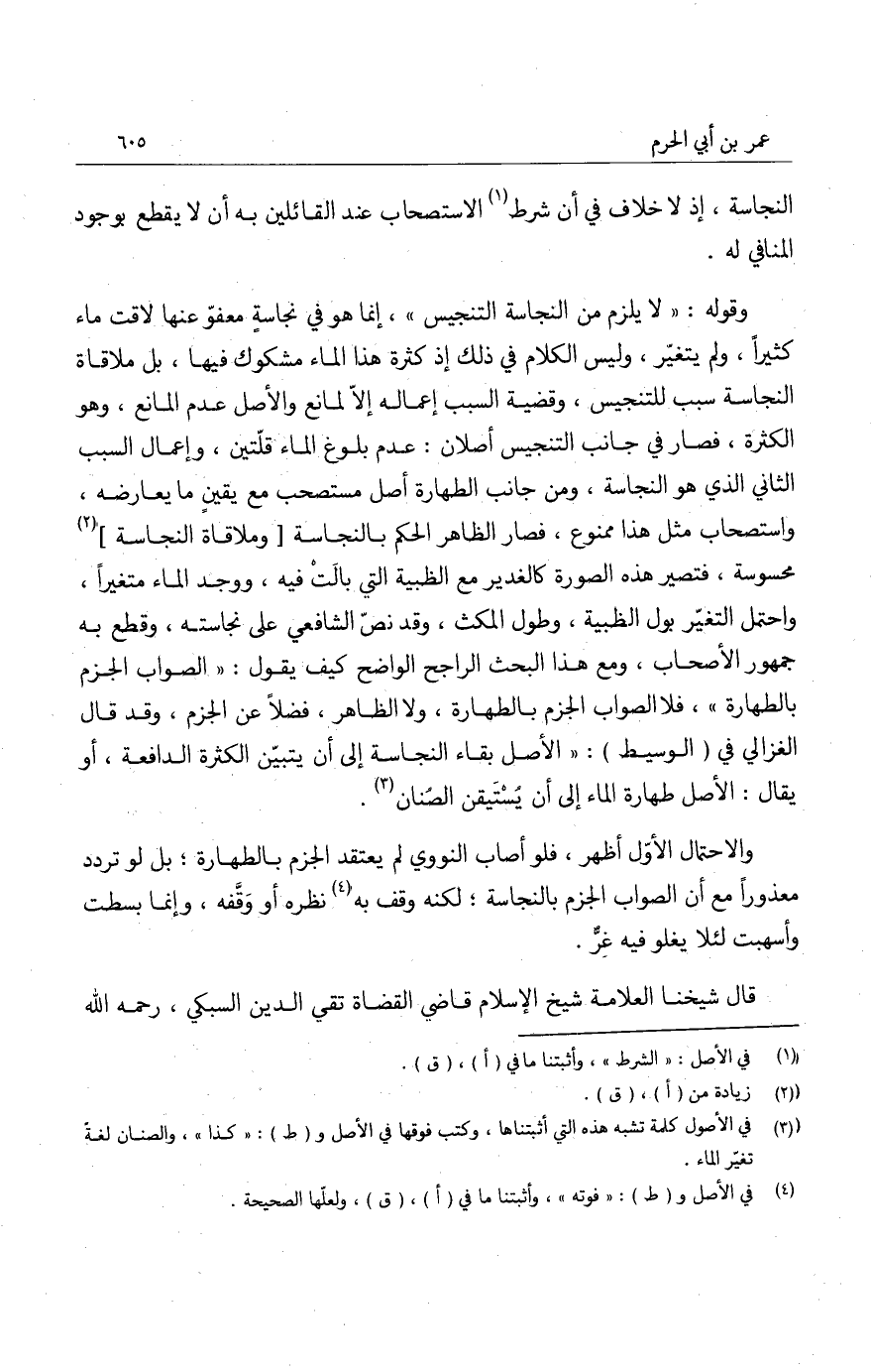 والاحتمال الأول أظهر، فلو أصاب النووي لم يعتقد الجزم بالطهارة؛ بل لو تردد معذوراً مع أن الصواب الجزم بالنجاسة؛ لكنه وقف به نظره أو وقفه، وإنما بسطت وأسهبت لئلا يغلو فيه غر.