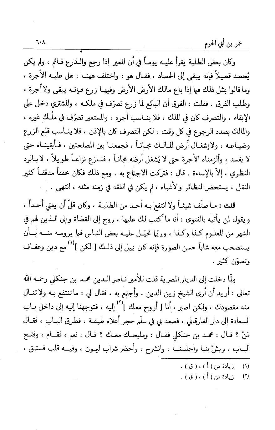 وكان بعض الطلبة يقرأ عليه يوماً في أن المعير إذا رجع والذرع قائم، ولم يكن يحصد قصيلاً فإ (نه يبقى إلى الحصاد، فقال هو: واختلف ههنا: هل عليه الأجرة، وما قالوا بمثل ذلك فيما إذا باع مالك الأرض وفيها زرع فإنه يبقى ولا أجرة، وطلب الفرق. فقلت: الفرق أن البائع لما زرع تصرف في ملكه، والمشتري دخل على الإبقاء، والتصرف كان في الملك، فلا يناسب أجره، والمستعير تصرف في ملك غيره، والمالك بصدد الرجوع في كل وقت، لكن التصرف كان الإذن، فلا يناسب قلع الزرع وضياعه، ولا إشغال أرض المالك مجاناً، فجمعنا بني المصلحتين، فأبقيناه حتى لا يفسد، وألزمناه الأجرة حتى لا يشغل أرضه مجاناً، فنازع نزاعاً طويلاً، لا بالرد النظري، إلا بالإساءة. قال: فتركت الاجتماع به. ومع ذلك فكان محققاً مدققاً كثير النقل، يستحضر النظائر والأشباه، لم يكن في الفقه في زمنه مثله، انتهى.