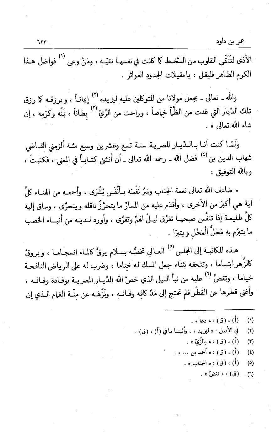 هذه المكاتبة إلى المجلس العالي تخصه بسلام يرق كالماء انسجاماً، ويروق كالزهر ابتساماً، وتتحفه بثناء جعل المسك له ختاما، وضرب له على الرياض النافحة خياما، وتقص عليه من نبأ النيل الذي خص الله الديار المصرية بوفادة وفائه، وأغنى قطرها عن القطر فلم تحتج إلى مد كافه وفائه، ونزهه عن منه الغمام الذي إن