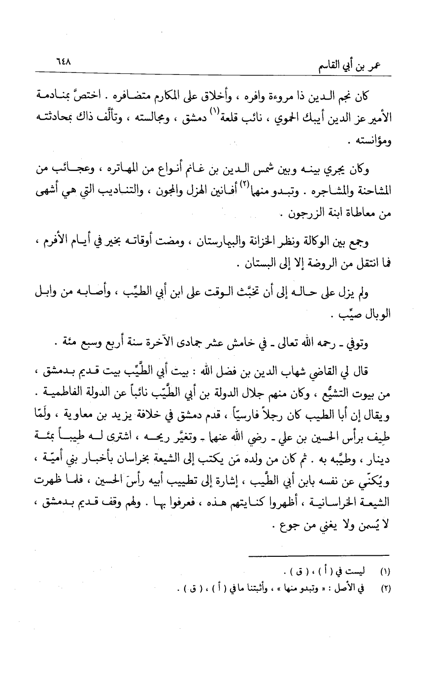 قال لي القاضي شهاب الدين بن فضل الله: بيت أبي الطيب بيت قديم بدمشق، من بيوت التشيع، وكان منهم جلال الدولة بن أبي الطيب نائباً عن الدولة الفاطمية. ويقال إن أبا الطيب كان رجلاً فارسياً، قدم دمشق في خلافة يزيد بن معاوية، ولما طيف برأس الحسين بن علي رضي الله عنهما وتغير ريحه، اشترى له طيباً بمئة دينار، وطيبه به. ثم كان من ولده من يكتب إلى الشيعة بخراسان بأخبار بني أمية، ويكني عن نفسه بابن أبي الطيب، إشارة إلى تطييب أبيه رأس الحسين، فلما ظهرت الشيعة الخراسانية، وأظهروا كنايتهم هذه، فعرفوا بها. ولهم وقف قديم بدمشق، لا يسمن ولا يغني من جوع.