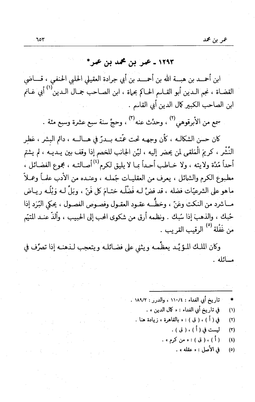 ابن أحمد بن هبة الله بن أحمد بن أبي جرادة العقيلي الحلبي الحنفي، قاضي القضاة، نجم الدين أبو القاسم الحاكم بحماة، ابن الصاحب جمال الدين أبي غانم ابن الصاحب الكبير كمال الدين أبي القاسم.