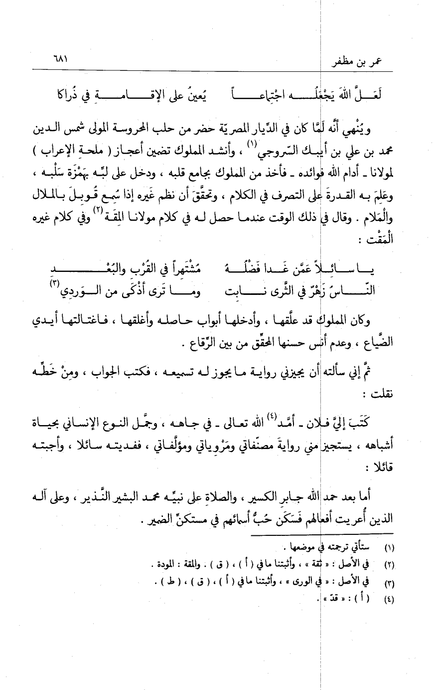 ولما انتهيت إلى استجازته التي انتظمت في سلوك الحسن بحسن السلوك، واستعظمت، فلولا حسن الظن لأوهمت تهكم المالك بالمملوك، أحجمت عن إجازة من شمر في العقل والنقل لتحقيق القديم والحديث، وتبحر في إغراب الإعراب حتى كأن النحاة إياه عنوا بمسألة سيرك السير الحثيث، وقلت: ماذا أصف، وبأي عباة أنتصف. في إجازة من إذا كتب طرز بالليل رداء نهاره، وإذا نثر فالأنجم الزهر بعض نثاره، وإذا نظم لم يقنع من الدر إلا بكباره، ولم يرض من المعاني إلا بدقيق من بين حجريه الثمينين بل أحجاره، إن أعرب ف؟ ويه على سيبويه، وإن نحا فهو الخليل غير مكذوب عليه، يأتي بما يفتر عنه المبرد، ويشق له الكسائي كساه ويجرد، ويقول الزجاجي: أيها الشاب لقد أخجلت جواهرك صرحي الممرد، وينادي ابن أبي الحديد: سطا علي لسانك المبرد، ويستخدم ملك النحاة في جنده، ويرفرف ابن عصفور عليه بجناحيه ويحلف أنه الخليفة من بعده، بتعمق يرهف حروف الحروف، وينصف حتى لا يعدو ثعلب ولا أكبر منه على ابن خروف،