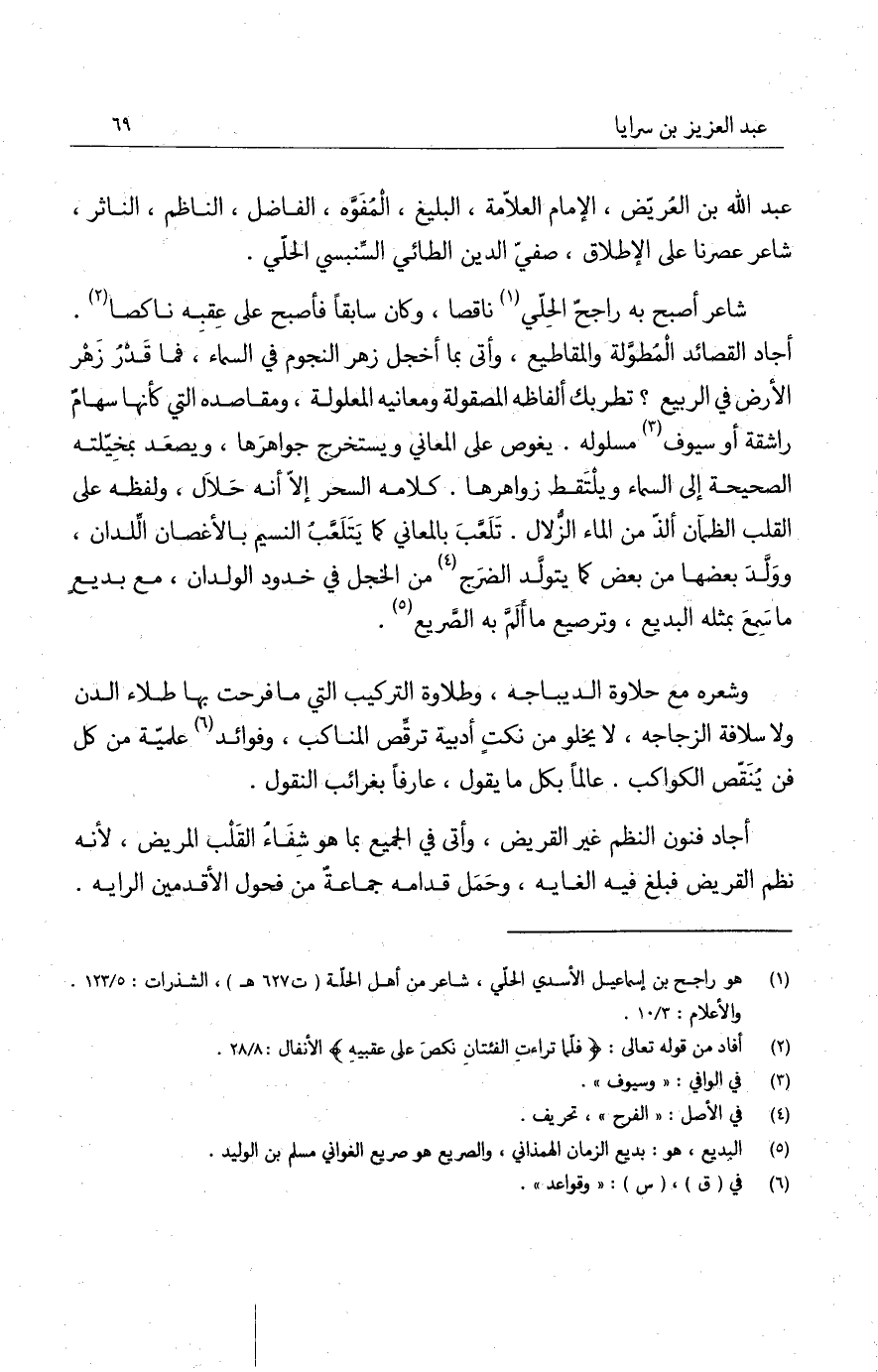 عبد الله بن العريض، الإمام العلامة، البليغ، المفوه، الفاضل، الناظم، الناثر، شاعر عصرنا على الإطلاق، صفي الدين الطائي السنبسي الحلي.
