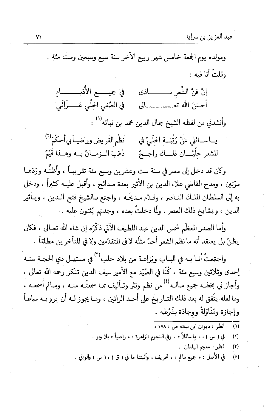واجتمعت أنا به في الباب وبزاعة من بلاد حلب في مستهل ذي الحجة سنة إحدى وثلاثين وسبع مئة، كنا في الصيد مع الأمير سيف الدين تنكز رحمه الله تعالى، وأجاز لي بخطه جميع ماله من نظم ونثر وتأليف مما سمعته منه، وما لم أسمعه، وما لعله يتفق له بعد ذلك التاريخ على أحد الرائين، وما يجوز له أن يرويه سماعاً وأجازة ومناولة ووجاده بشرطه.